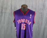Up for sale is a vintage Toronto Raptors jersey by Champion. It has a purple front and a black back with red and silver trim. The front of the jersey has Toronto and the number 15 screened on. The back of the jersey has Carter and the number 15 screened on. What a great jersey do not miss out on it.