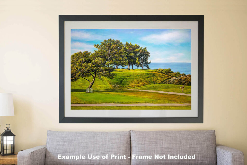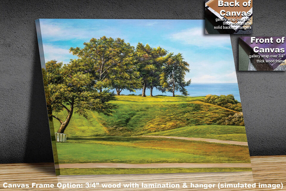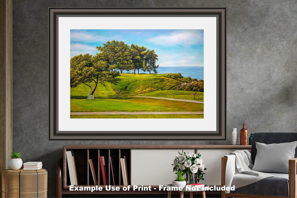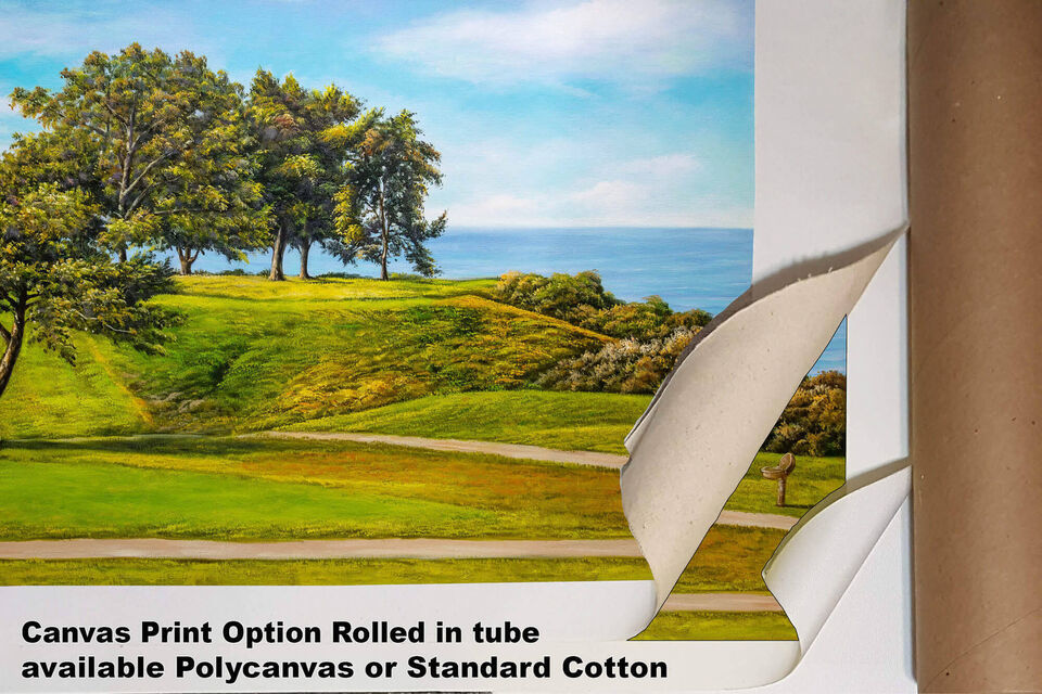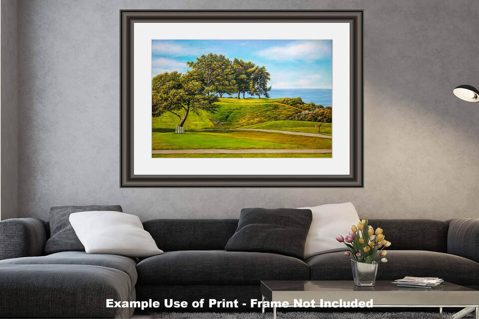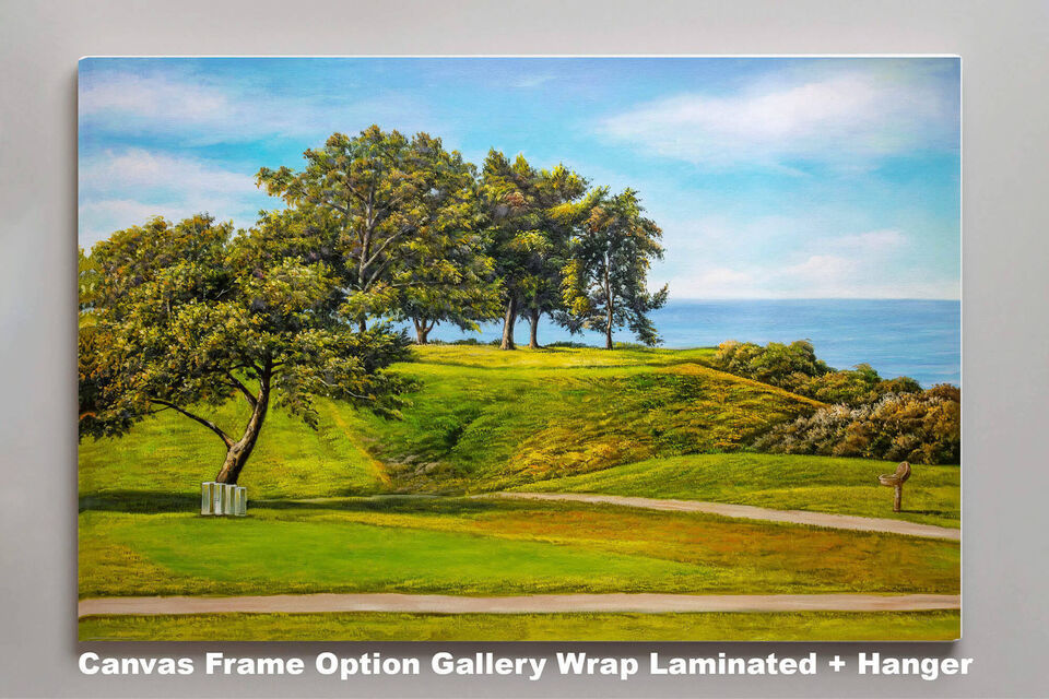 This fine art print from oil painting by Rich image features Scenic Golf Hole overlooking the Pacific Ocean Torrey Pines Golf Course. This Torrey Pines Golf Course Golf Hole title is a 11x14in Matte Paper Print, 28x36cm. The 192gm 10.3mil enhanced paper. It appears flat matte with no sheen (NOT shiny.) The print will appear as glossy as the glass when framed (mat, picture frame or glass NOT included.) SEE OPTIONS for Size Stye (8x10-40x50in) in choice of a fine art print on Matte Paper, gallery wrap canvas stretched over 3/4 inch thick wood frame, or high quality print on matte polyester or matte cotton canvas rolled and shipped in a tube. Viewing screens have different color calibration (light, dark, green cast, blue cast etc...) so the print color may vary. The print colors are calibrated to match the original art or photo.