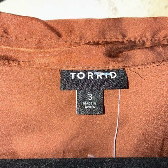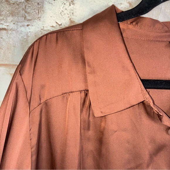 Torrid Madison Satin Button-Up Long Sleeve Shirt in Rootbeer Size 3X (22-24) NEW - 95 Polyester 5 Spandex - Collared neckline. Button front. Long sleeves. Lightweight, medium stretch, satin woven fabric