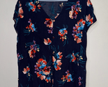 Stylish navy blouse with vibrant floral design. Features a flattering V-neck. Perfect for casual or dressy occasions.