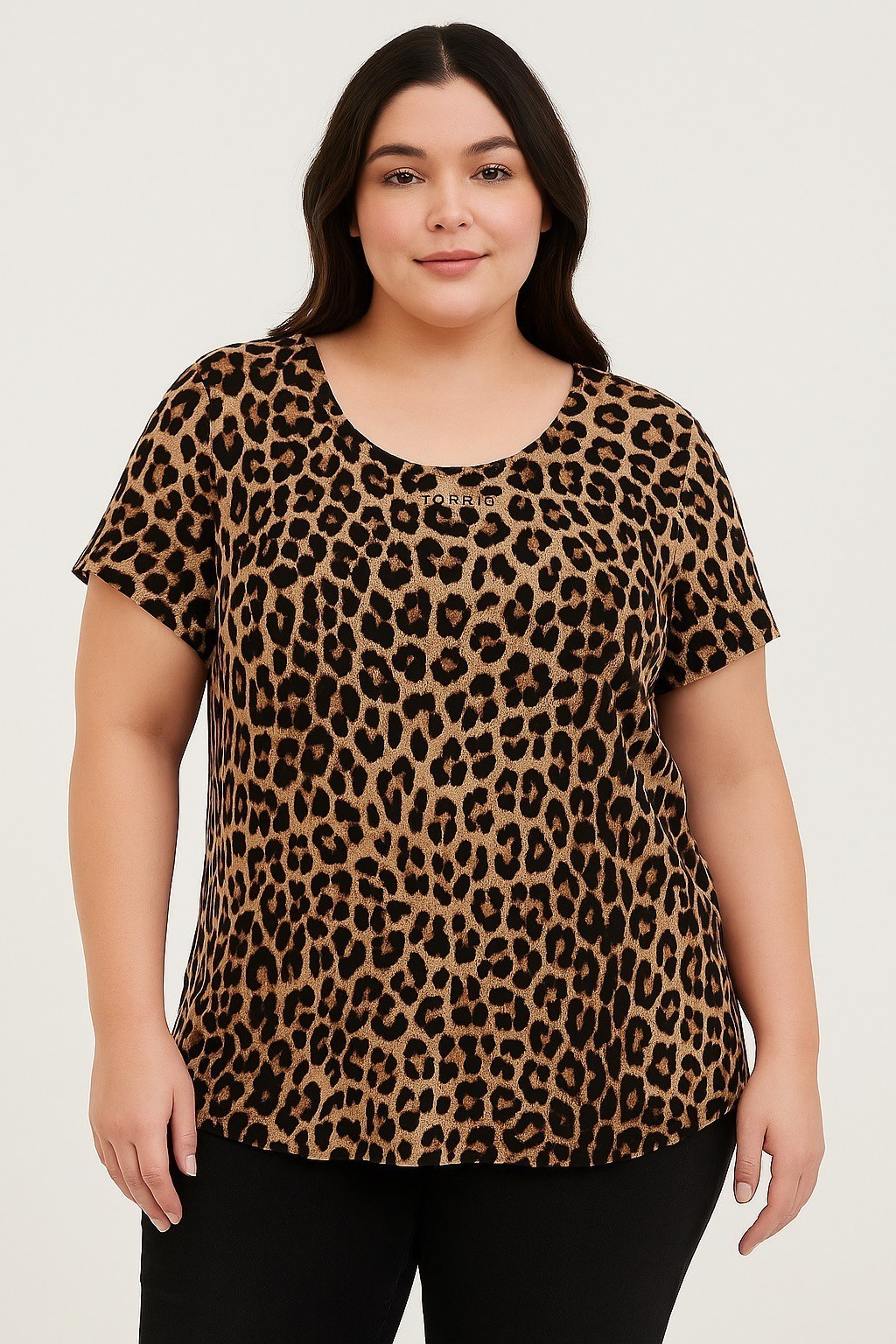 Stylish and ultra-soft Torrid Super Soft knit top featuring an allover leopard print. This relaxed fit short-sleeve top is perfect for casual wear or layering with your favorite jacket. The lightweight stretch fabric provides comfort with a flattering drape.