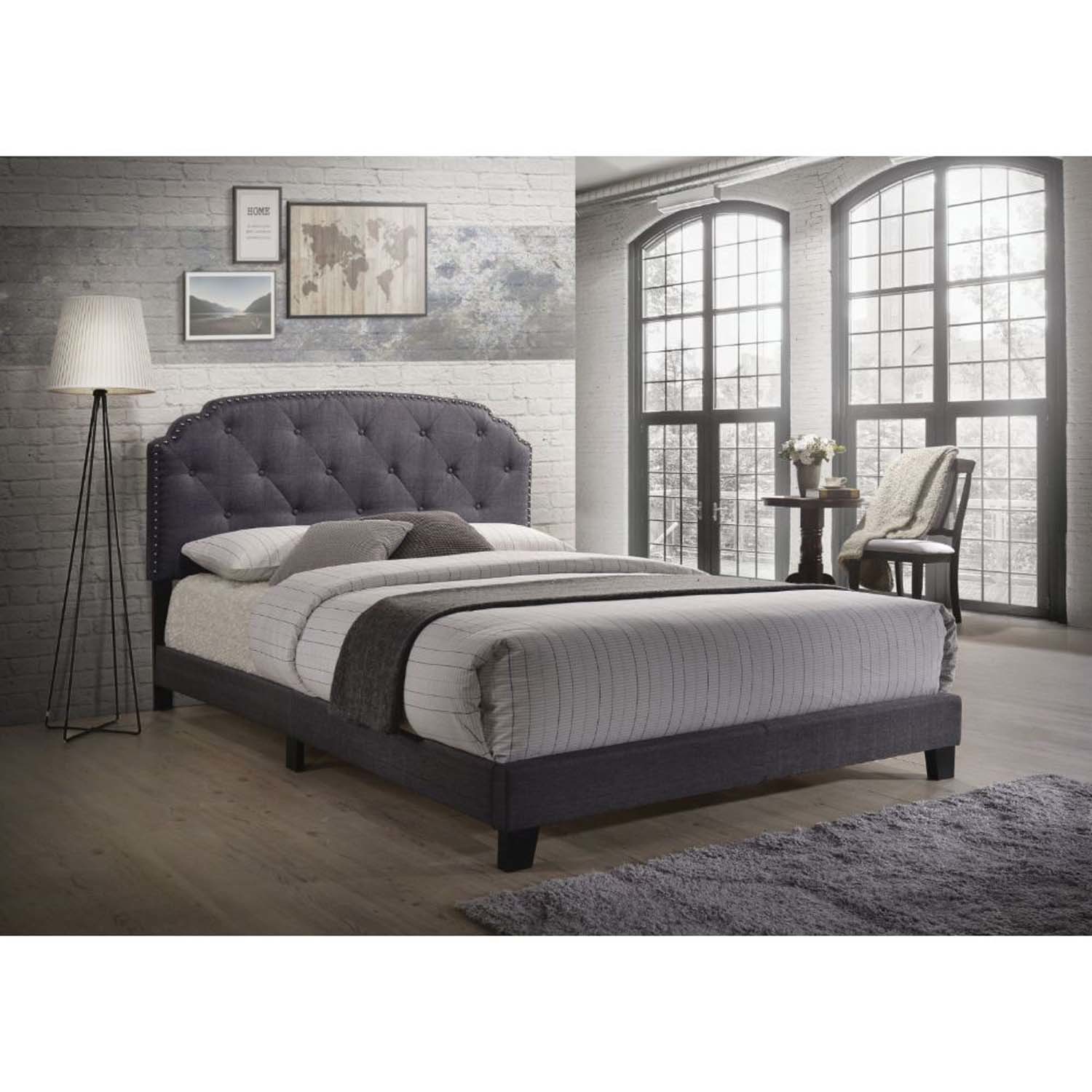 Features: Panel Bed 4 Slats - Box Spring Required Padded Bed: Fabric Button Tufted, Arched Shape Panel Headboard with Nailhead Trim (16mm), Low Profile Footboard, Headboard Leg: 21" (535mm) Wooden Leg: Black Finish, Rubberwood Set Includes: One (1) Queen Size Bed