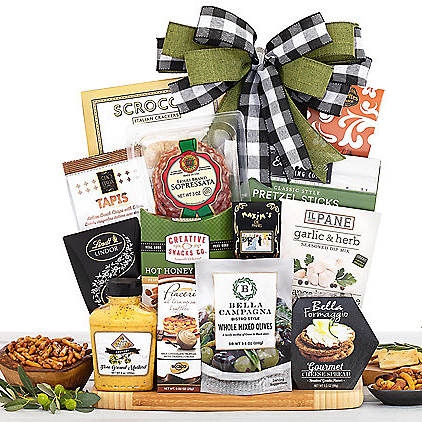 This gift, packed on a bamboo cutting board, is ready to be served, shared and relished. Sopressata salame, Dijon mustard, olives, smoked Gouda cheese spread, Italian rosemary crackers, milk chocolate tiramisu and Godiva lava cake truffles, Ghirardelli dark chocolate and milk chocolate with caramel, spicy honey crunch trail mix, bacon habanero snacks and more are arranged to create a lasting impression.