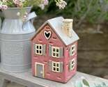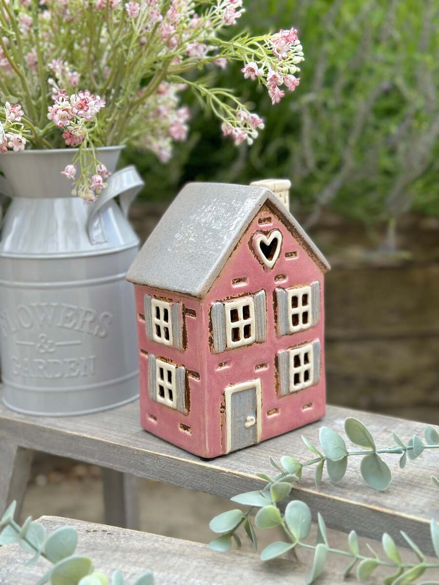 Pink with grey roof with very cute grey window shutters and front door. This adorable village cottage also features a love heart loft window.