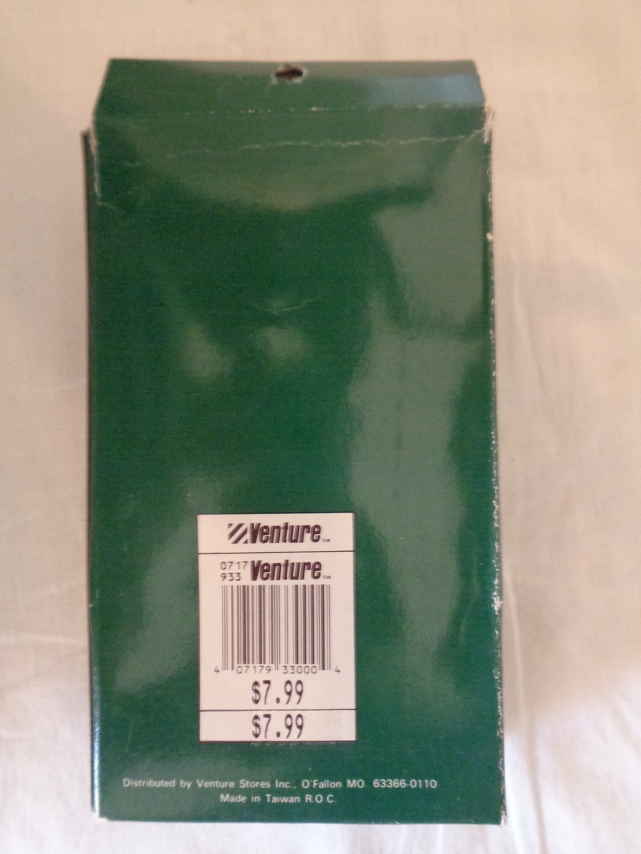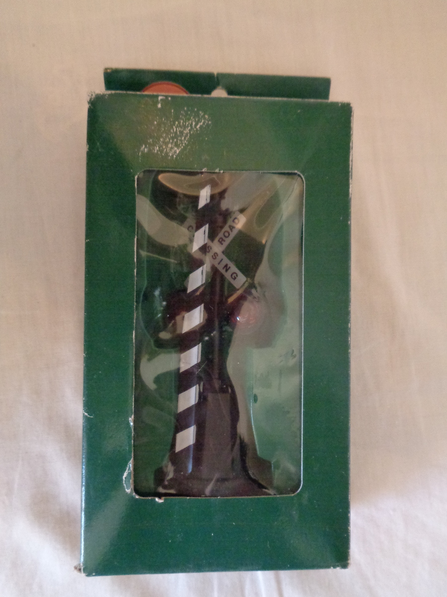 #6430 Train Crossing Sign by Memories Collection. Distributed by Venture Stores, Inc. O’Fallen, Missouri and was made in Taiwan. UPC: 407179330004. It is used and was tested and the rail road warning is loud and clear, the gate does not come down, but I don’t think it was meant to. It takes two AA Batteries, not included. It is approximately 5 inches tall and inch wide at the base. Please see pix for a complete description.