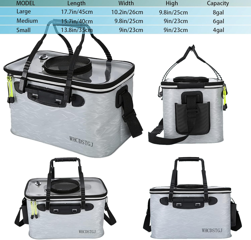WHCDSTGJ fishing gear can be used as a fishing bait bucket, ice fishing bucket, fish protection bucket, fisherman bucket, live bait bucket, bait bucket, or ice fishing bait bucket. Widely used as a fish carrier, fish transportation container, and live fish transportation container. Suitable for boats, yachts, kayaks, ice fishing, and other places.Outdoor camping for water bag use.