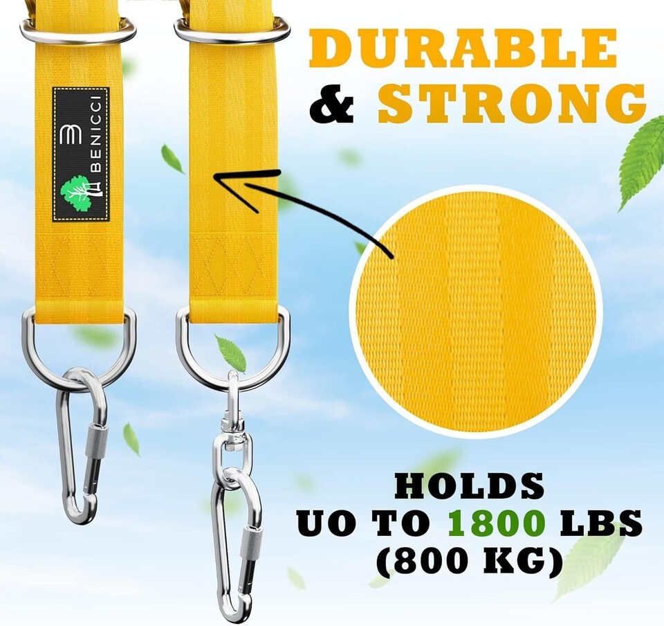 10FT Long Heavy Duty Swing Tree Straps made from durable yellow polyester webbing, designed for safety and reliability.