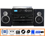 The Trexonic 3-S peed Vinyl Turntable Home Stereo System with CD Player, Dual Cassette Player, Wired Shelf Speakers, FM Radio CD/USB/SD Recording blends seamlessly into your decor yet, adds a special touch of sophistication to your entertainment center. This compact yet powerful system will allow you to enjoy your favorite music from a wide range of media such as cassettes, vinyl records, CDs, digitally recorded music from your USB Flash Drive, SD Card or content from your Bluetooth enabled devices.