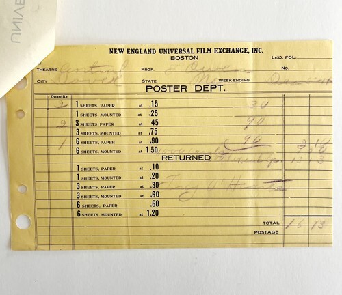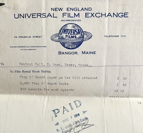 Invoice from Universal Films New England Film Exchange to what was then Central Hall (now Center Theater) in Dover-Foxcroft, Maine for various things (listing many so contents vary) like tickets, posters, etc....