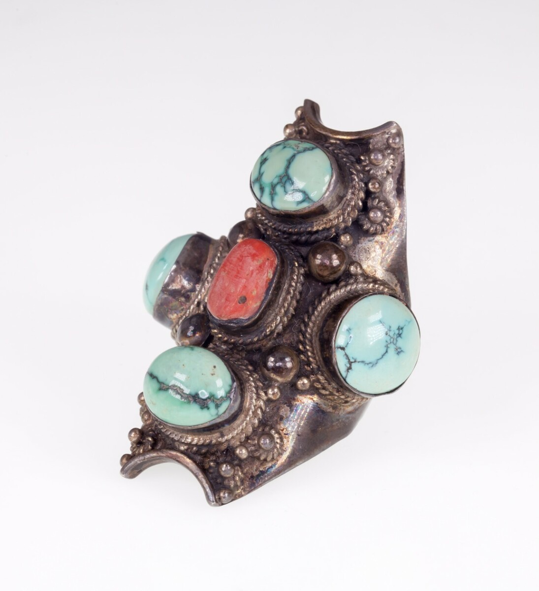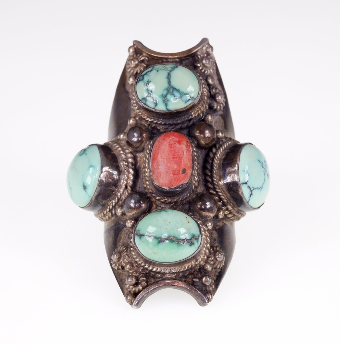 Silver Afghanische Plakette Ring Mit Samen Türkis Akzent Und Lang Koralle Perlen