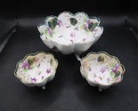 Trio of footed bowls, made in Japan, blue and gold accorns, leaves and flowers, one large 3" tall by 5 1/2" diameter and 2 small 1 3/4" tall by 3" diameter, very good condition, unmarked?80B-BASKTRACK6