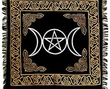 Triple Moon Goddess Pentacle Altar Cloth. This Altar Cloth features a Triple Moon and Pentacle Center surrounded by Celtic Knots. Gold and silver print on black material and fringe on all four edges. Measures approximately 18 x 18 inches.