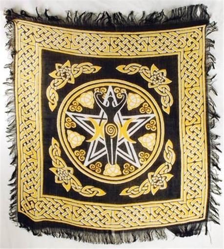 Bordered in Celtic knot work, the altar cloth focuses upon an intricate pentagram which includes Celtic Triquetra and Triskel patterns within its five points. At the center of this is an image of the goddess, backed by the triple moon symbol positioned where as the full moon is represented by a spiral over the womb. Such imagery is perfect for your altar space.