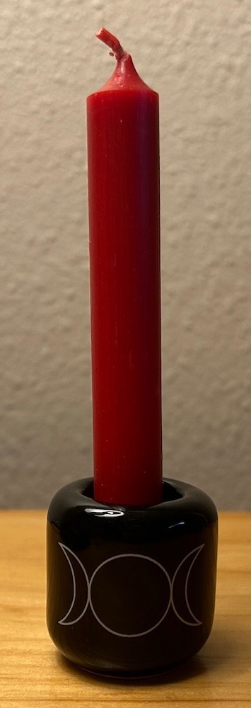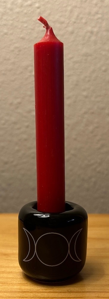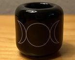 This simple yet elegant cube candle holder is painted black with a white triple moon. Perfect for an altar or home decor. Fits chime candles only, about 1.25 inches tall. Candle not included.