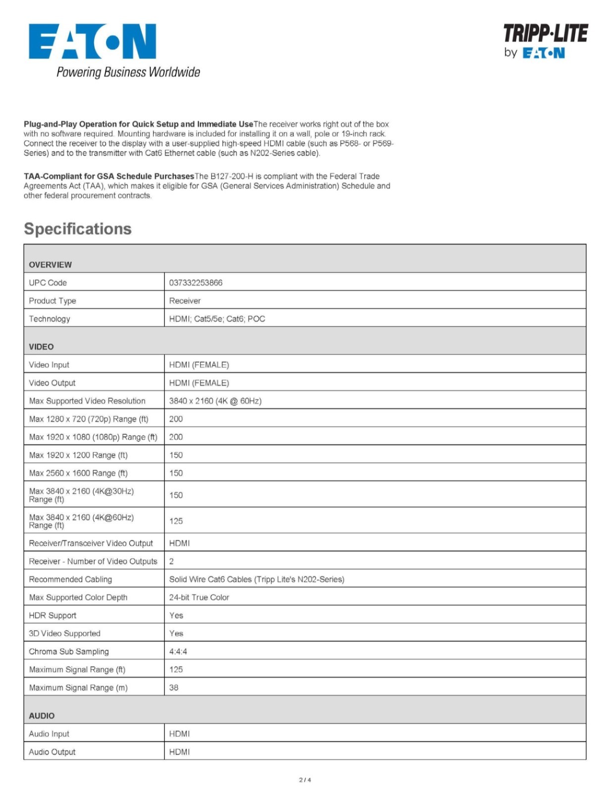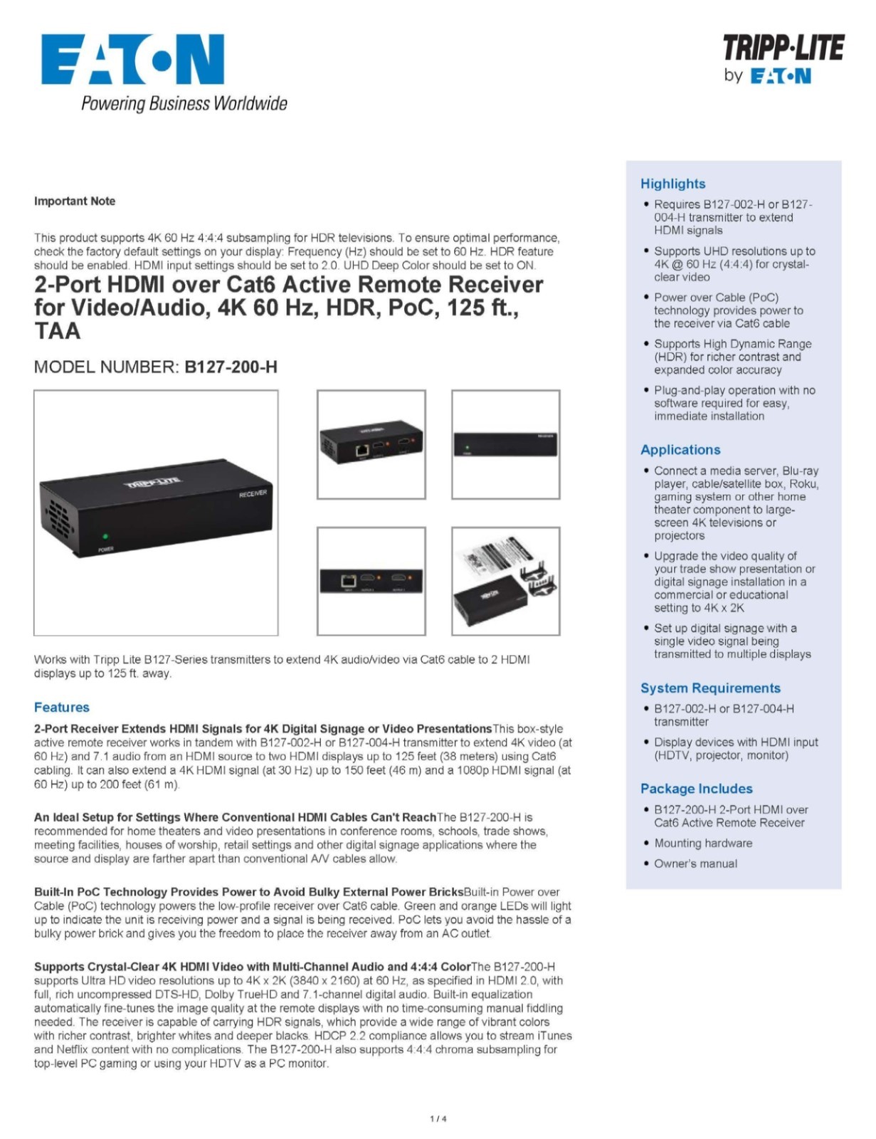 - Tripp Lite B127-200-H 2-Port HDMI Over Cat6 Active Remote Receiver PoC 4K
