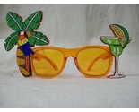 Wacky Tropical Plastic Costume Sunglasses. The lens have attached palm tree with parrot and a margarita drinks with a slice of lime on the sides. The frame is orange, the lens is orange. Lens are 100% UV Protection UV 400. Whether you're in your parrothead garb and on your way to a Jimmy Buffett concert, chillin' with a Boat Drink in Margaritaville, or heading to a Luau for a Cheeseburger in Paradise - You'll be the life of the party with the party glasses. One size fits most. Novelty Sunglasses for cosmetic use. Does not provide any vision correction.