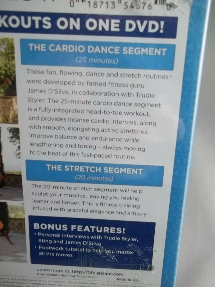 Also has bonus features: personal interviews with Trudie Styler, Sting and James D'Silva and footwear tutorial to help you master all the moves. There is music from Sting's Labyrinth Album and featured songs: "Fields of Gold" and "Message in a Bottle".