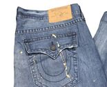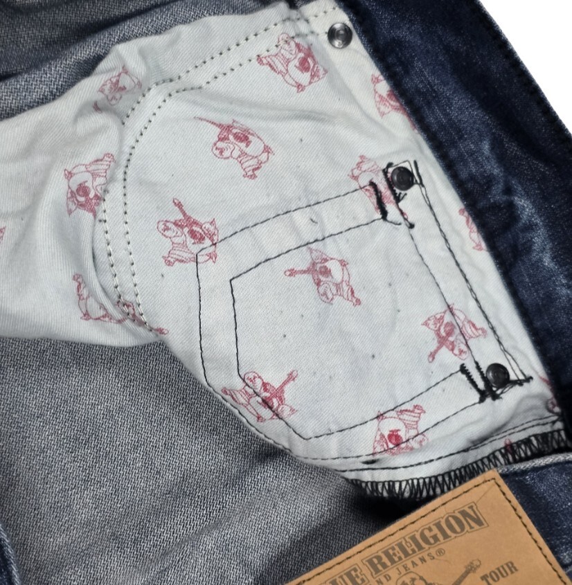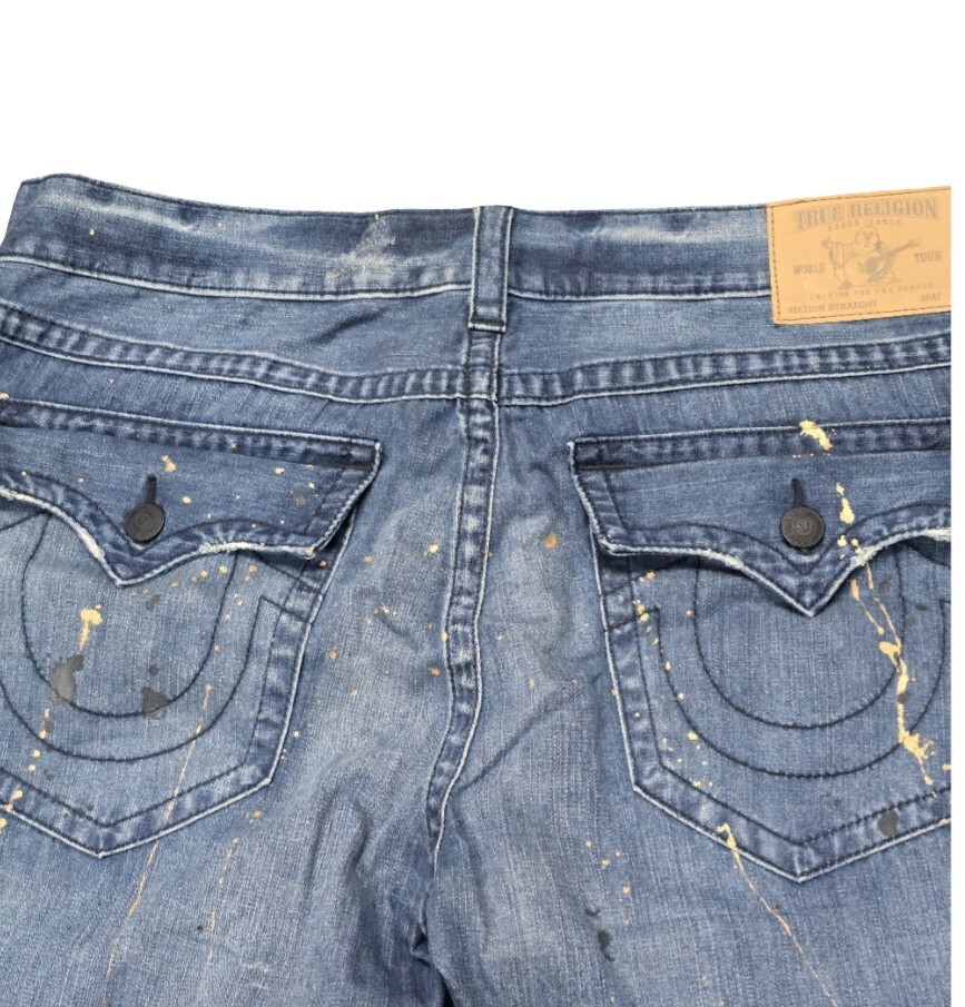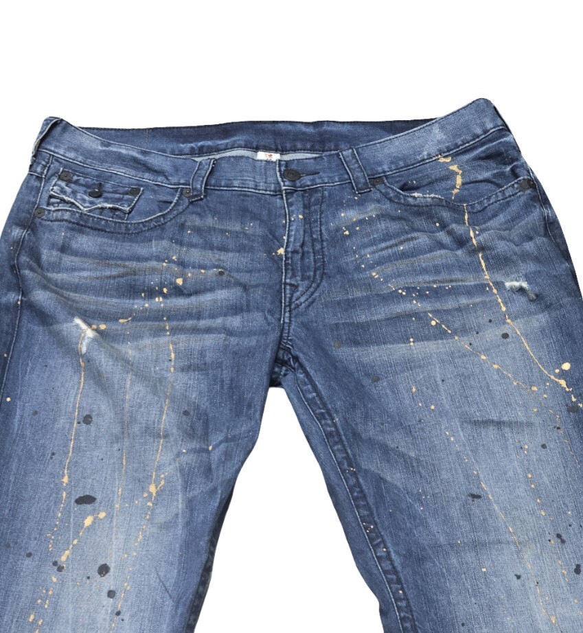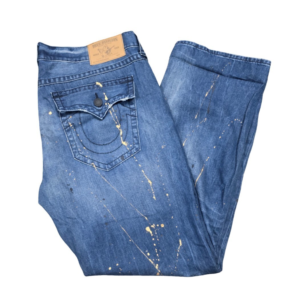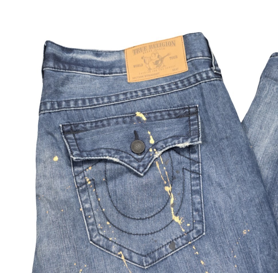 - True Religion Men’s 42x33 Straight Leg Blue Denim Jeans Painted Flap Pockets