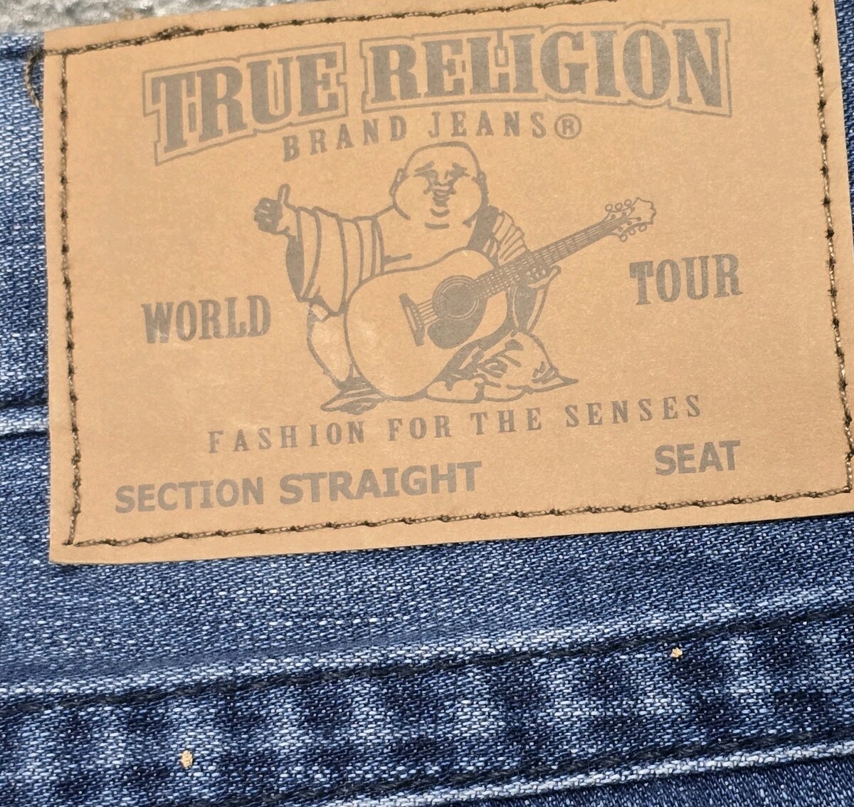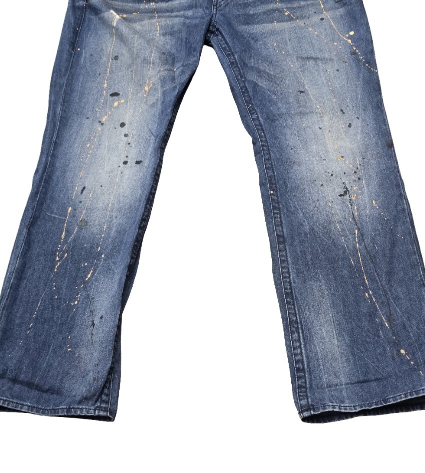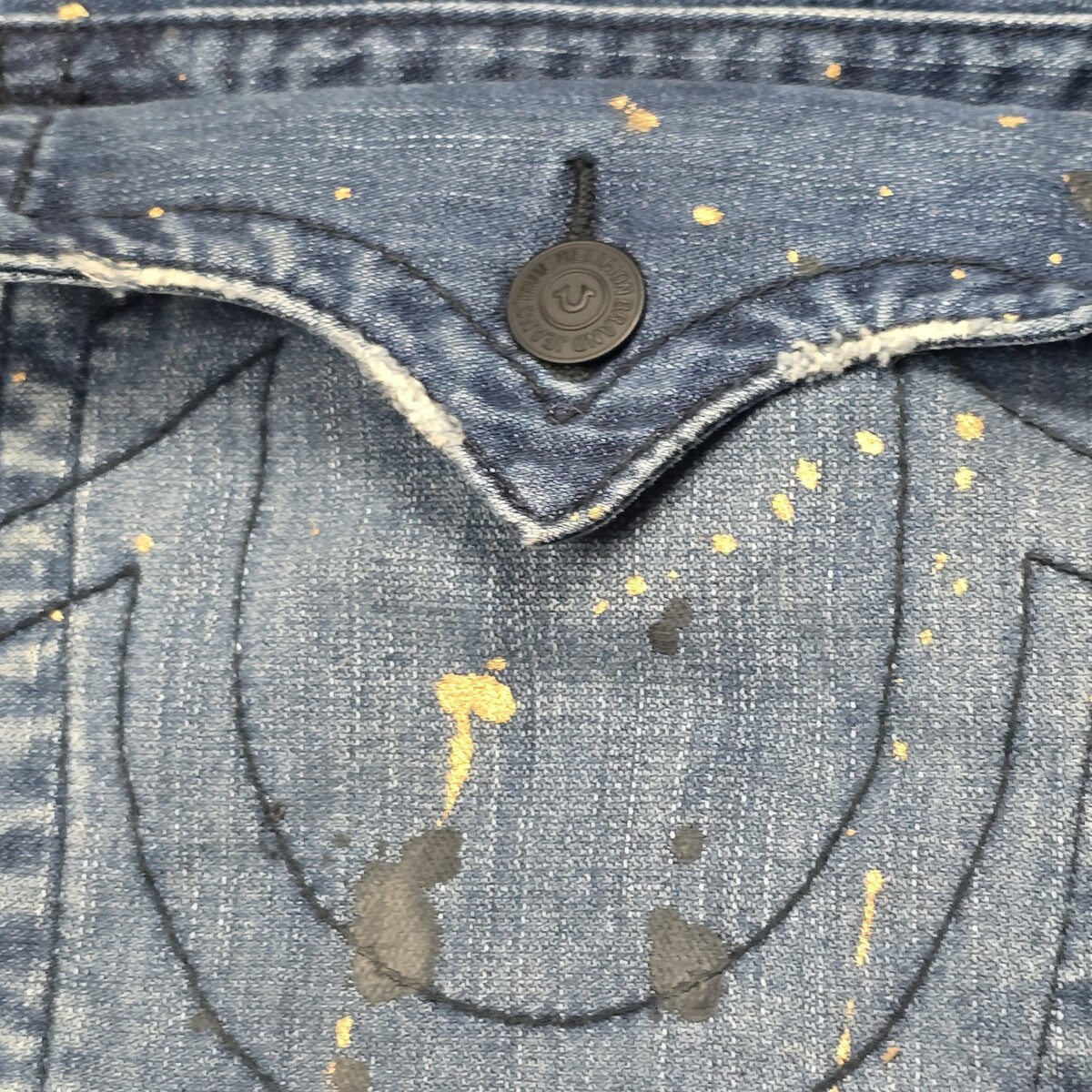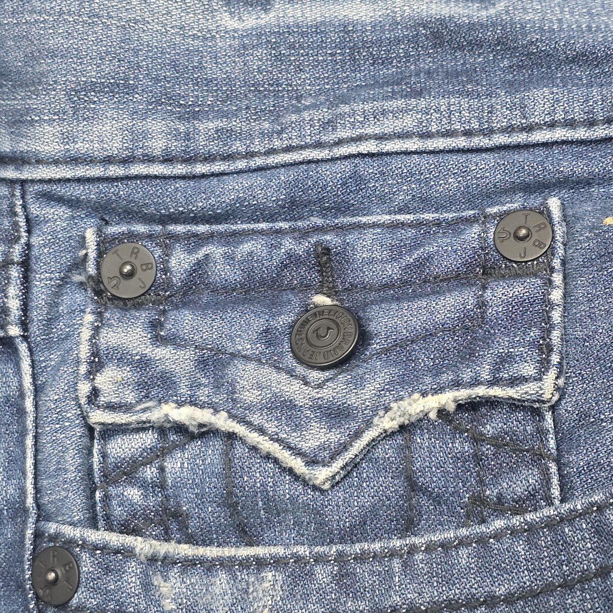 - True Religion Men’s 42x33 Straight Leg Blue Denim Jeans Painted Flap Pockets