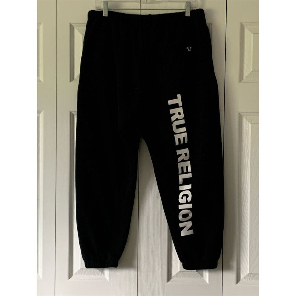 Keywords: True Religion, jogger pants, black joggers, unisex pants, medium size, casual wear, elasticated cuffs, drawstring waistband, tapered leg, logo detail, comfortable fabric, pre-owned joggers.