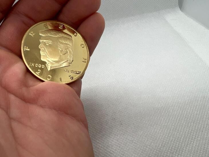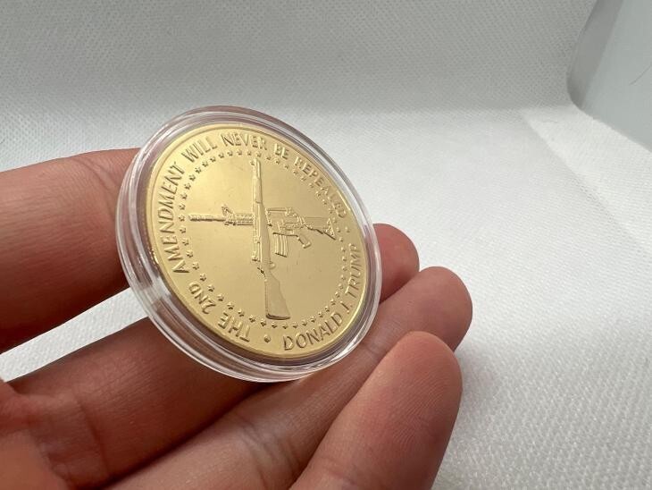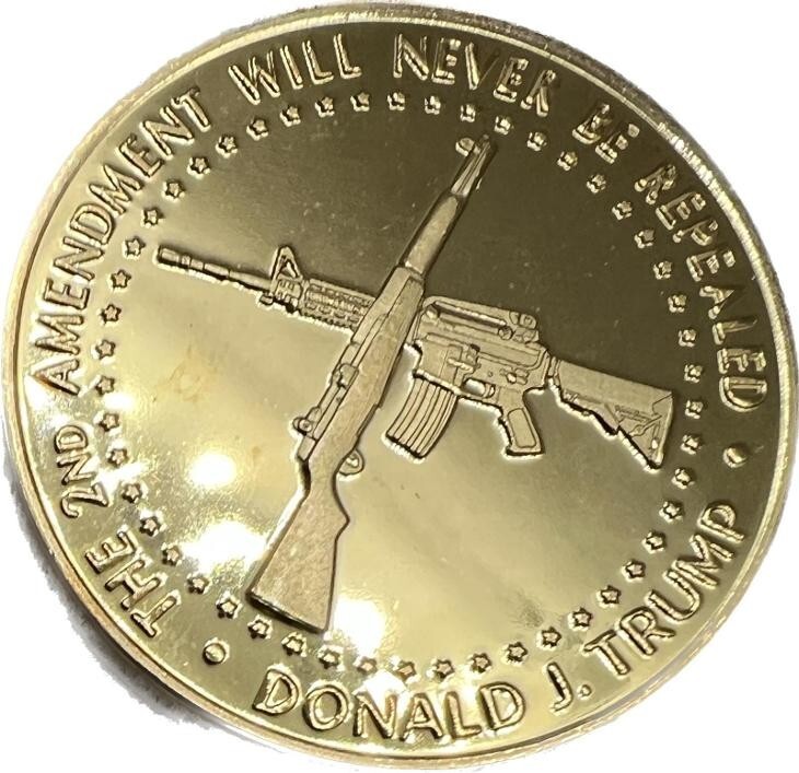 Introducing the Trump Commemorative Medal 2019 - Fantasy Coin, a unique collectible that embodies the intersection of politics and numismatic artistry. This elegantly designed coin features a profile of Donald J. Trump, the 45th President of the United States, prominently displaying the inscriptions "FREEDOM," "IN GOD WE TRUST," and the year 2019. These powerful phrases symbolize fundamental American values and the unwavering faith in divine providence.On the reverse side of the coin, an automatic firearm is depicted, symbolizing the Second Amendment of the United States Constitution, a topic that has sparked numerous political discussions. The assertive phrase "THE 2ND AMENDMENT WILL NEVER BE REPEALED" reflects the steadfast commitment to this amendment within American society and its legal framework.This commemorative medal serves as both a piece of political commentary and a collector's item, appealing to individuals with varying perspectives on its significance. Created in 2019, this coin may be tied to notable political events and campaigns, exemplifying how numismatics can serve as a medium for conveying specific sociopolitical messages.Please feel free to inquire about any additional details. This item is a newly produced piece, crafted with precision and thoughtfulness for educational, research, artistic, and historical purposes. Buyers acknowledge the intended use of this product upon purchase, as it is not intended for the promotion of any particular ideology.