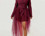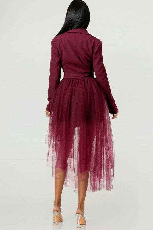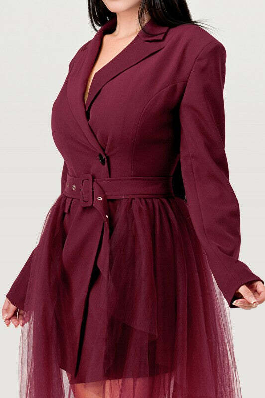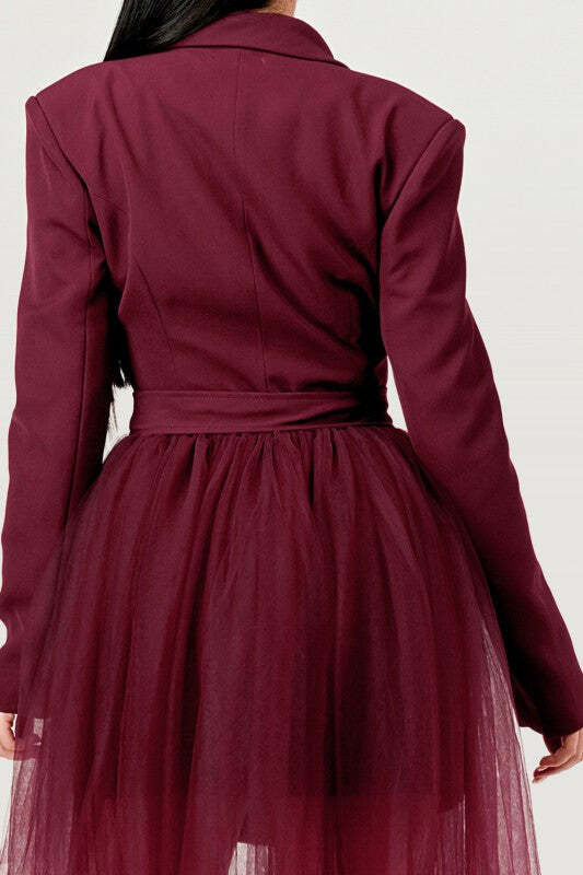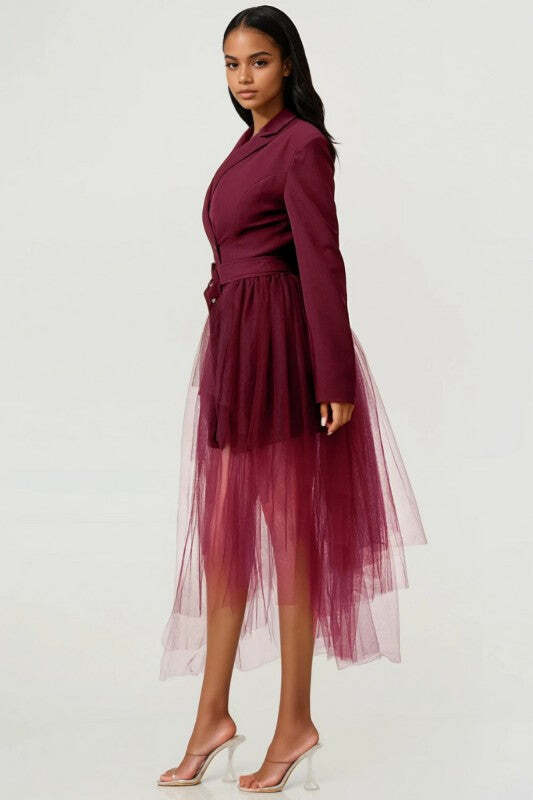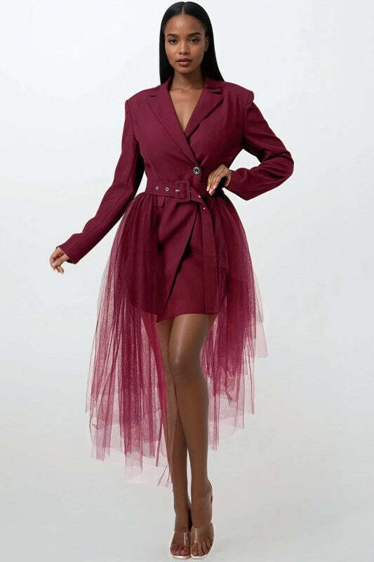 Sophistication meets high fashion in this dramatic blazer dress, designed with a couture-inspired twist. Crafted in a deep wine tone, this tailored piece features strong shoulders, a sharp lapel, and a belted waist that cinches for a flattering silhouette. The standout feature? A voluminous layered tulle overlay that adds texture, contrast, and runway-worthy movement from every angle.