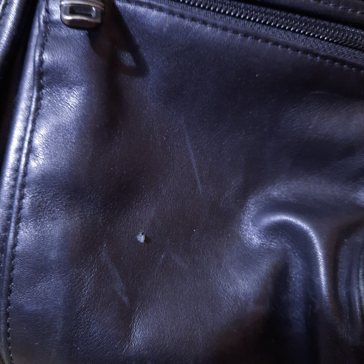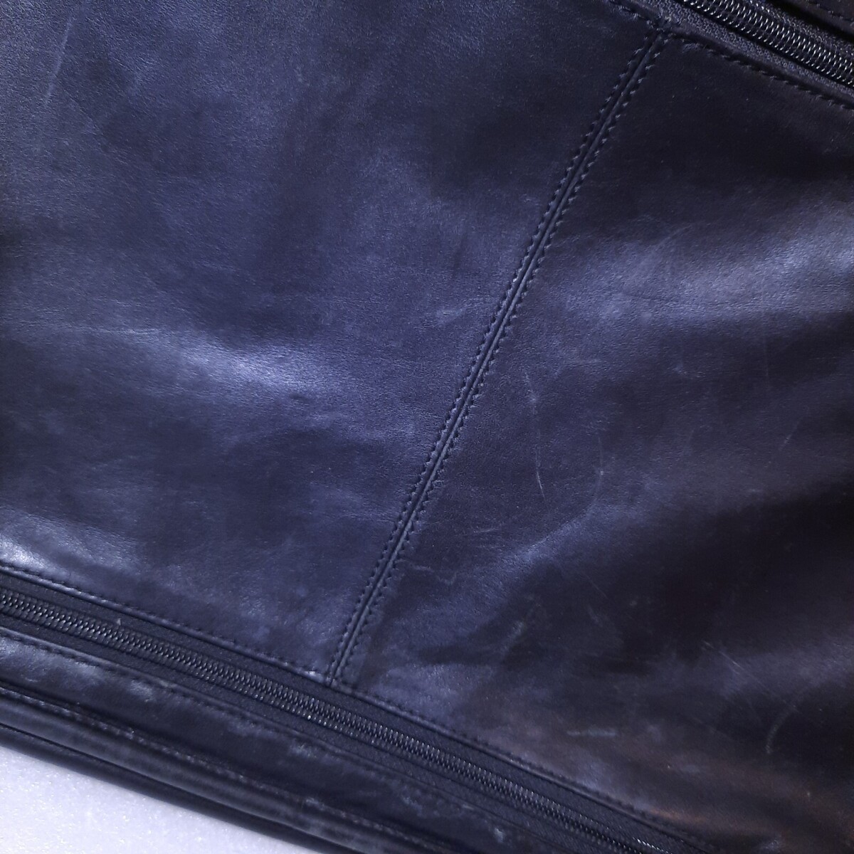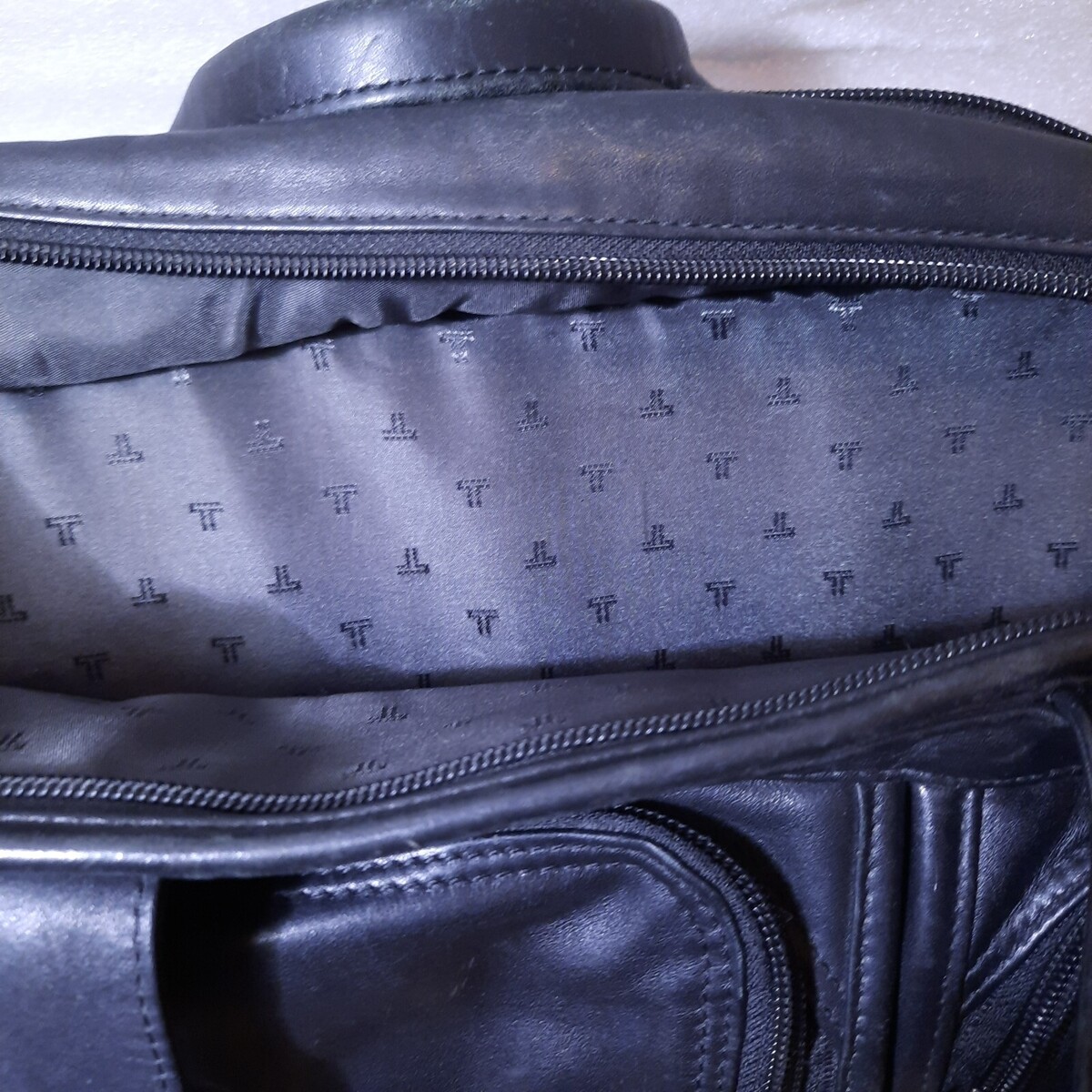 Lots of pockets to keep you organized. Handheld(no extra strap provided) Some distressing/wear/patina(small spot of leather peeling as shown) Initial lightly embossed on front. Nice and clean and ready for a new owner.