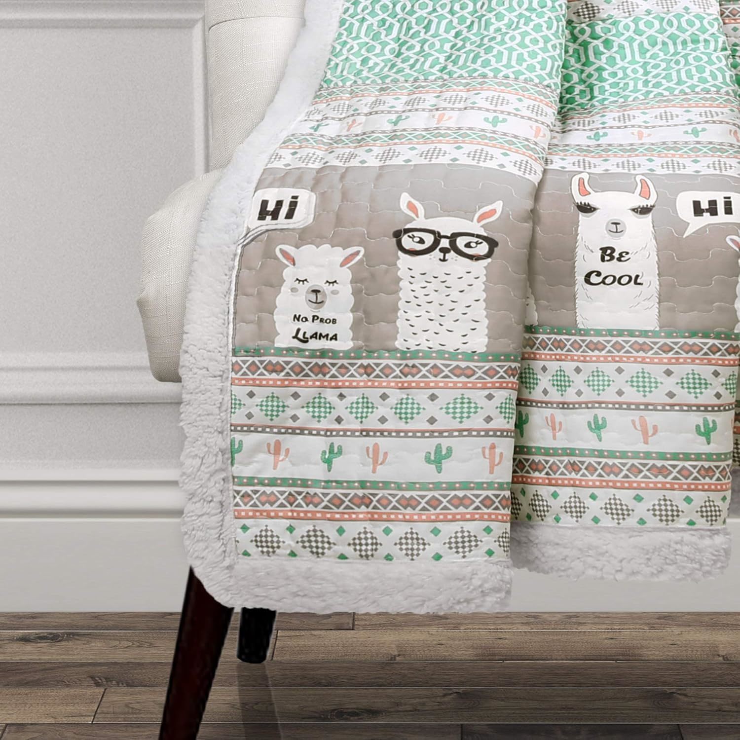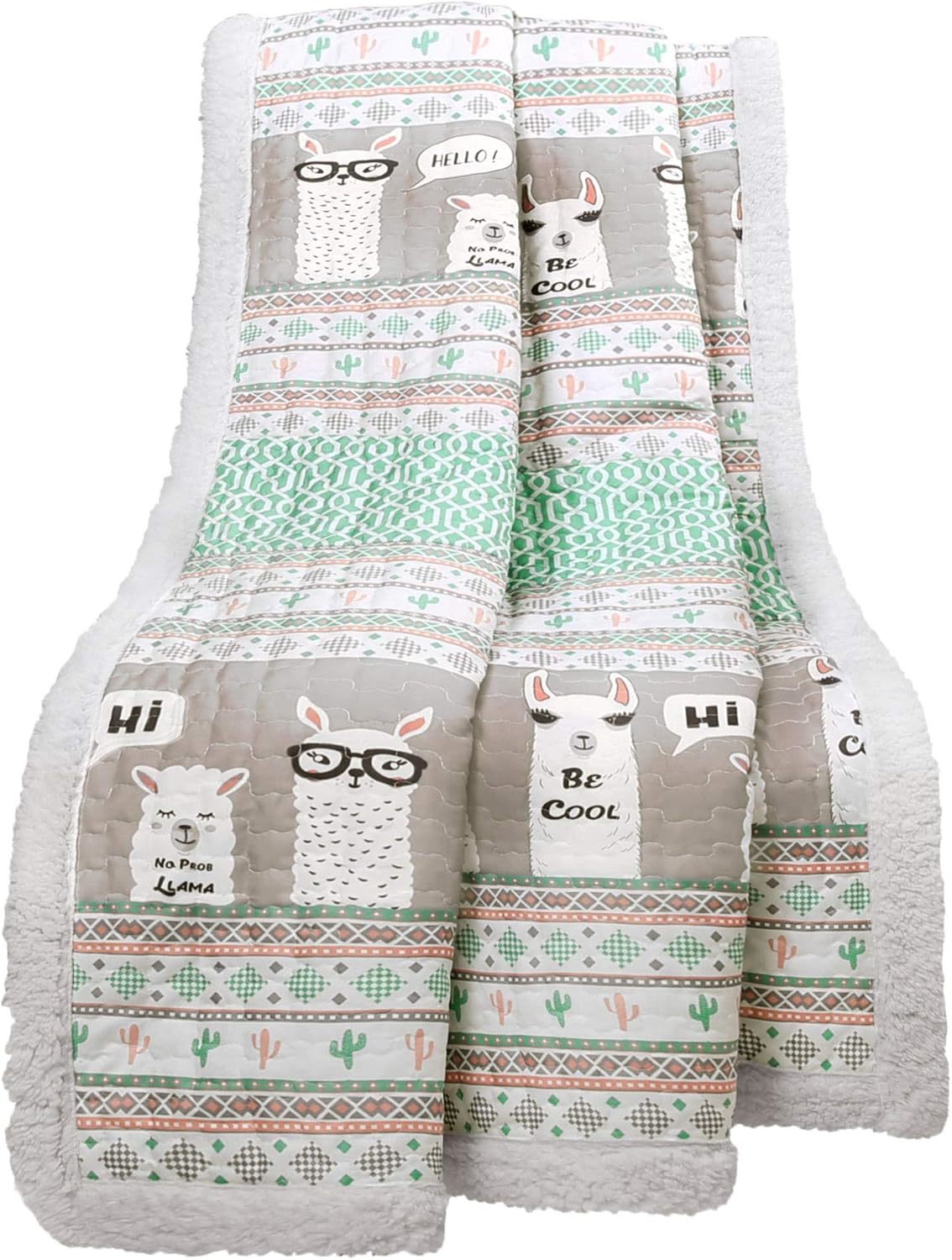 Your children will adore this uniquely designed soft and comfortable throw Blanket. Rows of llamas and geometric patterns come together to create the perfect look for your kid?s bedroom. The Sherpa lining on the back will keep your child warm and cozy. Llama Stripe Sherpa Throw also makes an excellent choice for a crate blanket.