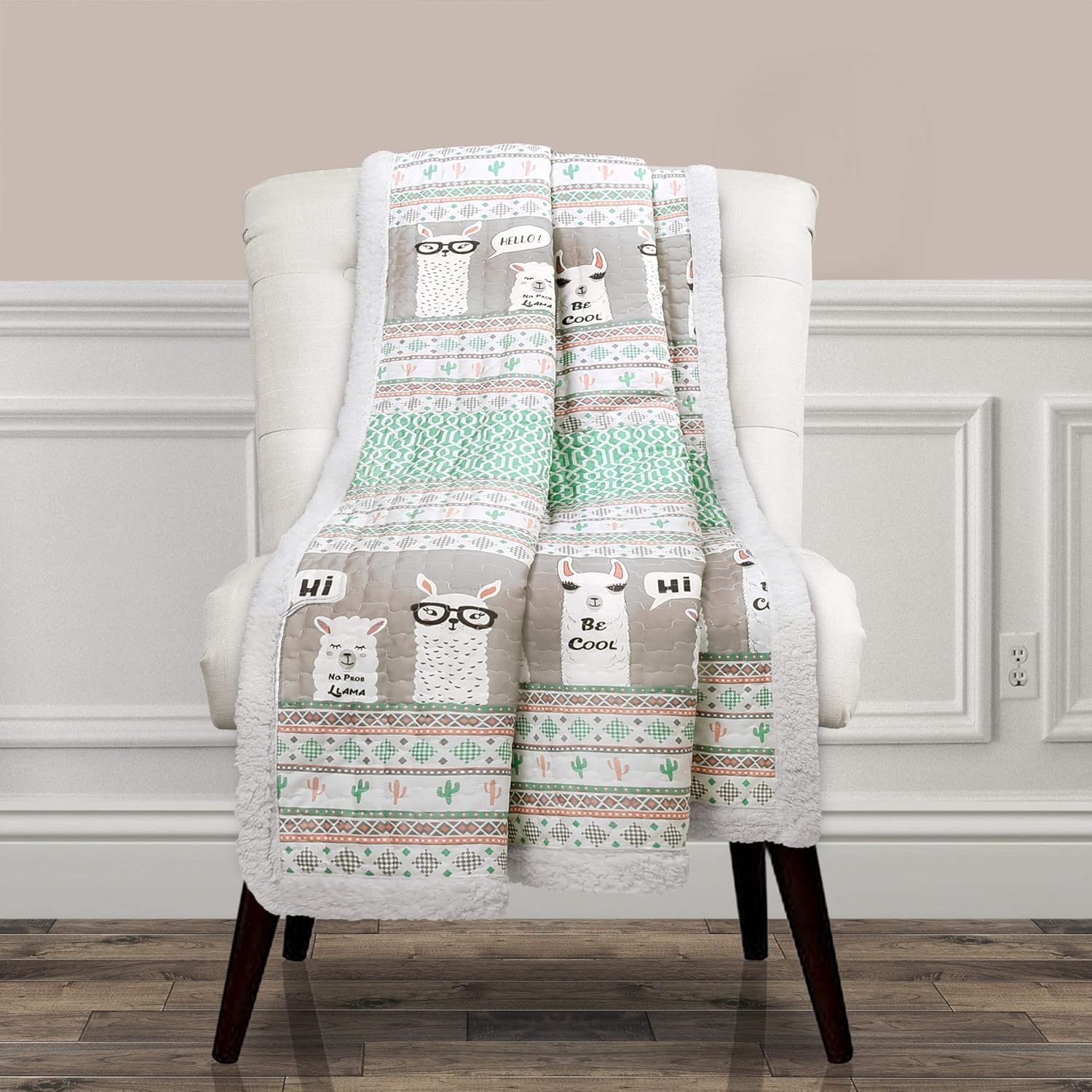 100% Polyester Soft, 100% polyester fabric reversible sherpa throw measures 60? x 50?. Rows of trendy llamas and geometric designs make for a cute, comfortable throw. A perfect fuzzy llama blanket for the living room, foot of the bed, nursery or as a gift. Decorative, pink and turquoise design set against a white background for a beautiful, functional throw. Throw is easy to care for and safe to machine wash cold and tumble dry low. Do not iron.