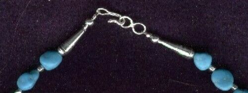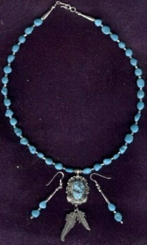 In creating this necklace and earring set I selected Sleeping Beauty end drilled nuggets, a sterling pendant set with a free form turquoise cab, 3 mm faceted sterling beads, sterling cones, a sterling hook and eye clasp and sterling earring wires. The pendant was make in New Mexico and is is stamped sterling and signed with the letter E. It is about 1 1/2" by 1" plus two sterling feathers for an overall length of 3 1/4". The necklace is 19 1/2" in length and the earrings are 1 3/4" plus the earring wires.