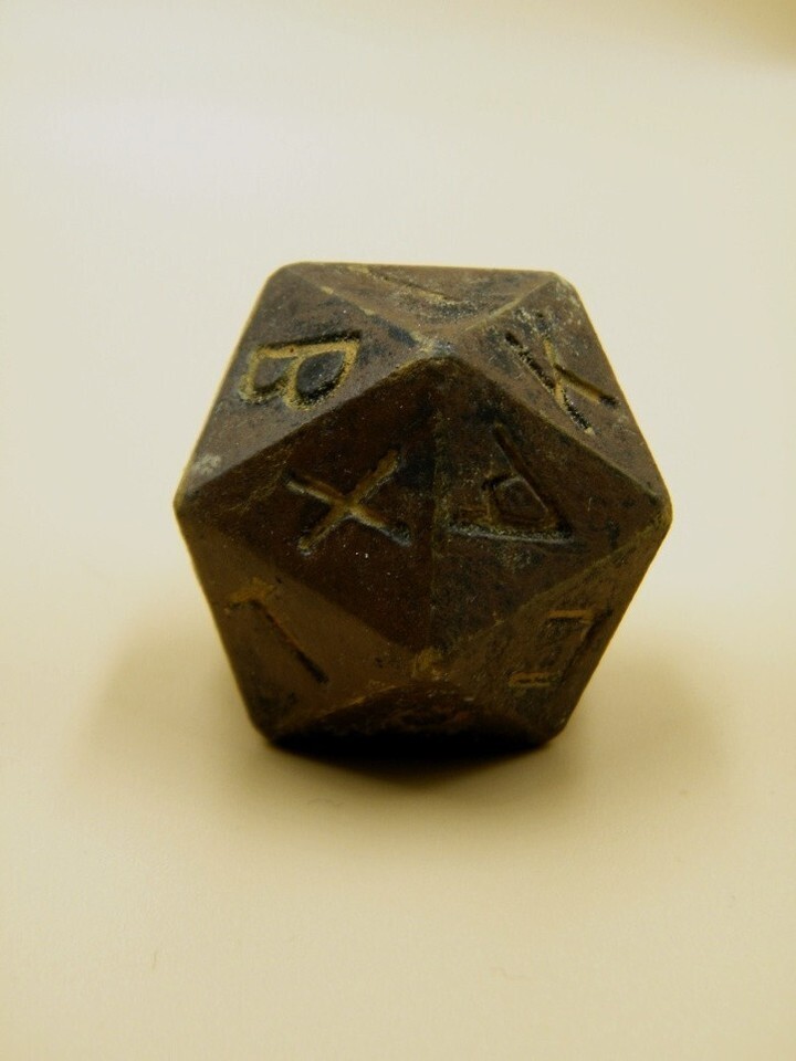 - Twenty-sided die (icosahedron) with faces inscribed with Greek letters - replica