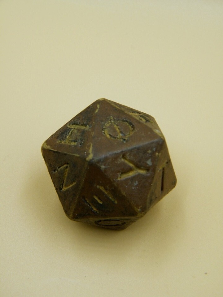- Twenty-sided die (icosahedron) with faces inscribed with Greek letters - replica