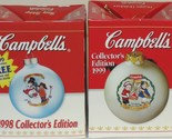 This is a set of two (1998 1999) Campbell's Collector's Edition ball globe glass ornaments in the original display boxes.