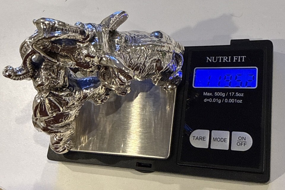 Wonderful small figurine featuring two embracing or dueling elephants made of sterling silver. This figurine weighs 119 grams total and has no other marks aside from 925. The figure is about 3.25 inches tall at the peak, about four inches wide, and 1.25 inches thick. I cannot confirm if this is solid silver or casted over a resin or mold. I would think so but it?s not marked with the Riempito mark to confirm.