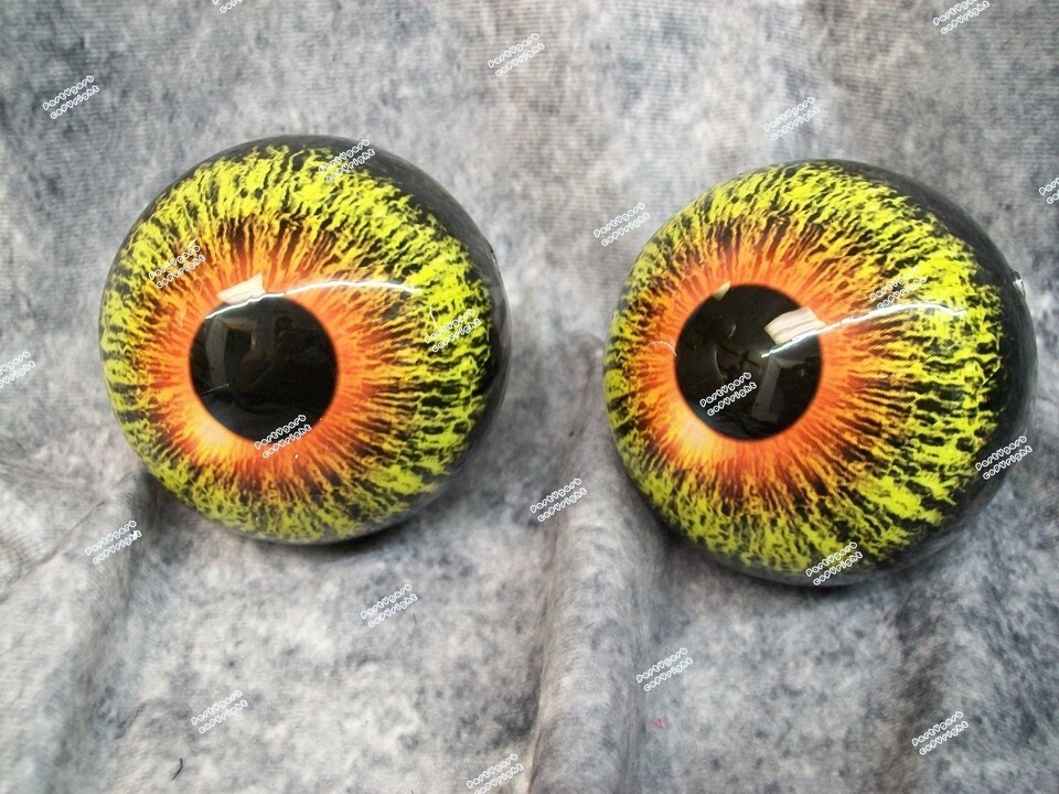 Orange and Yellow with a Round Pupil Look. Great addition for a Prop. Could be used for Creepy Monster. Foam Balls covered with a shiny Plastic. Small flat spots on some of the balls. Some of the plastic looks cracked but it must be on the underneath as the surface is all smooth. Eye print on two sides. Small - Approx. Size: 2.5". Bulk Packed. No Tags, No Packaging. Has small hole on one end could be put on a skewer if desired.