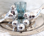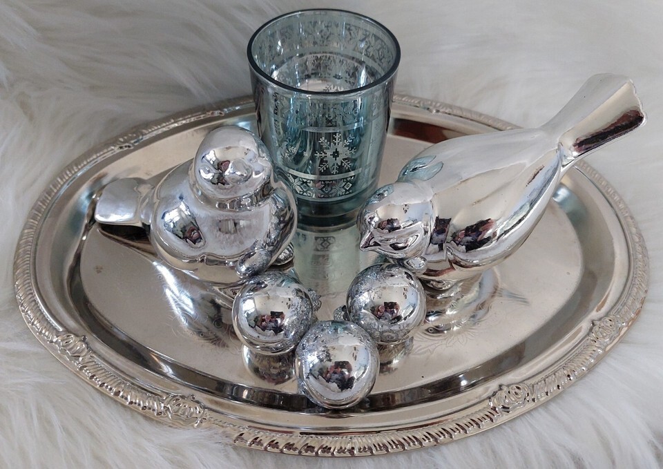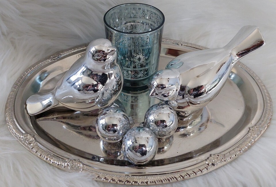 - Two Silver Christmas Songbird Bird Figurines Candle Jar & Tray Lot