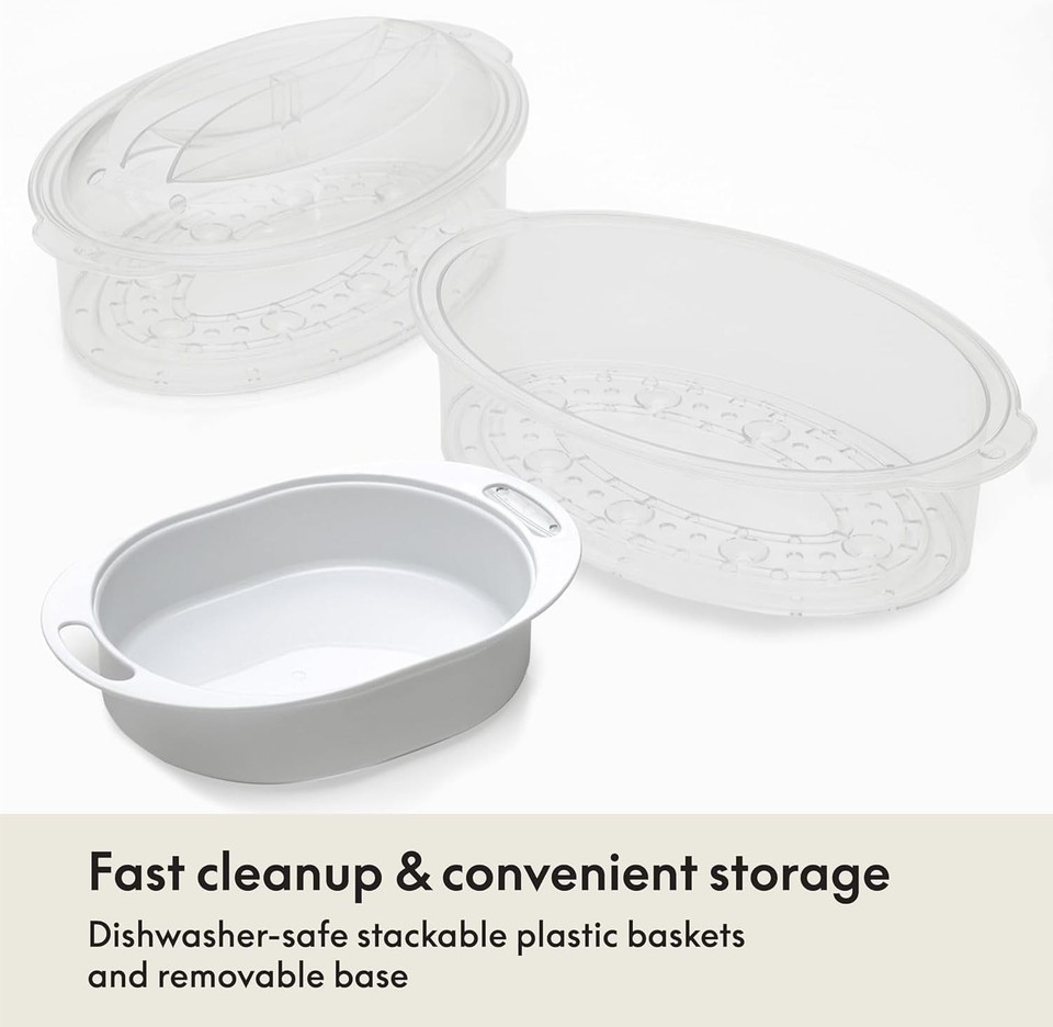 STACKABLE BASKETS REMOVABLE BASE: The removable base makes it easy to clean your electric cooker and veggie steamer. The stackable Plastic baskets make it easy to store your food once it's done and can be removed safely washed in your dishwasher