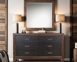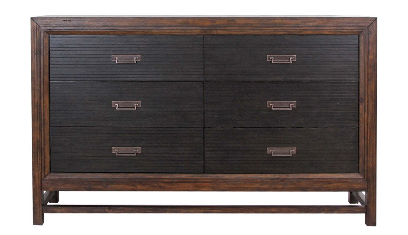 This Six-Drawer Dresser delivers a unique and modern interpretation of Arts and Crafts style. Constructed from Pine Solids and Pine Veneers, this dresser boasts a Two-Tone Rustic Buckeye and Black Finish complete with Antique Brass Hardware. Featuring felt-lined jewelry and top drawers, a stretcher base, shutter slat and unique mitered framing details, this dresser will provide ample storage for clothing and jewelry and make a striking addition to your main or spare bedroom. Fully assembled upon arrival, this piece is ready to unbox and enjoy.