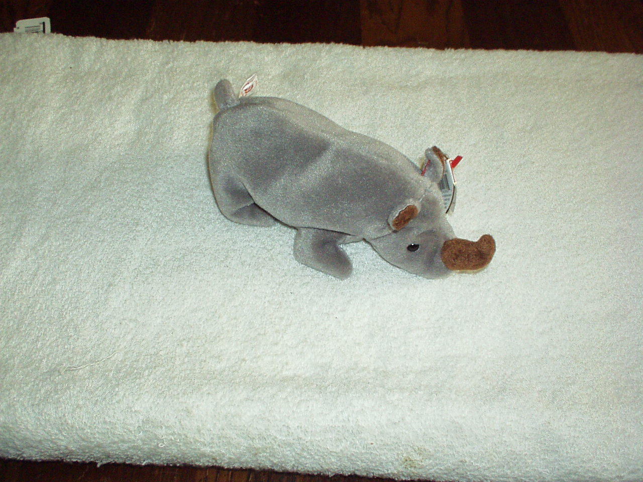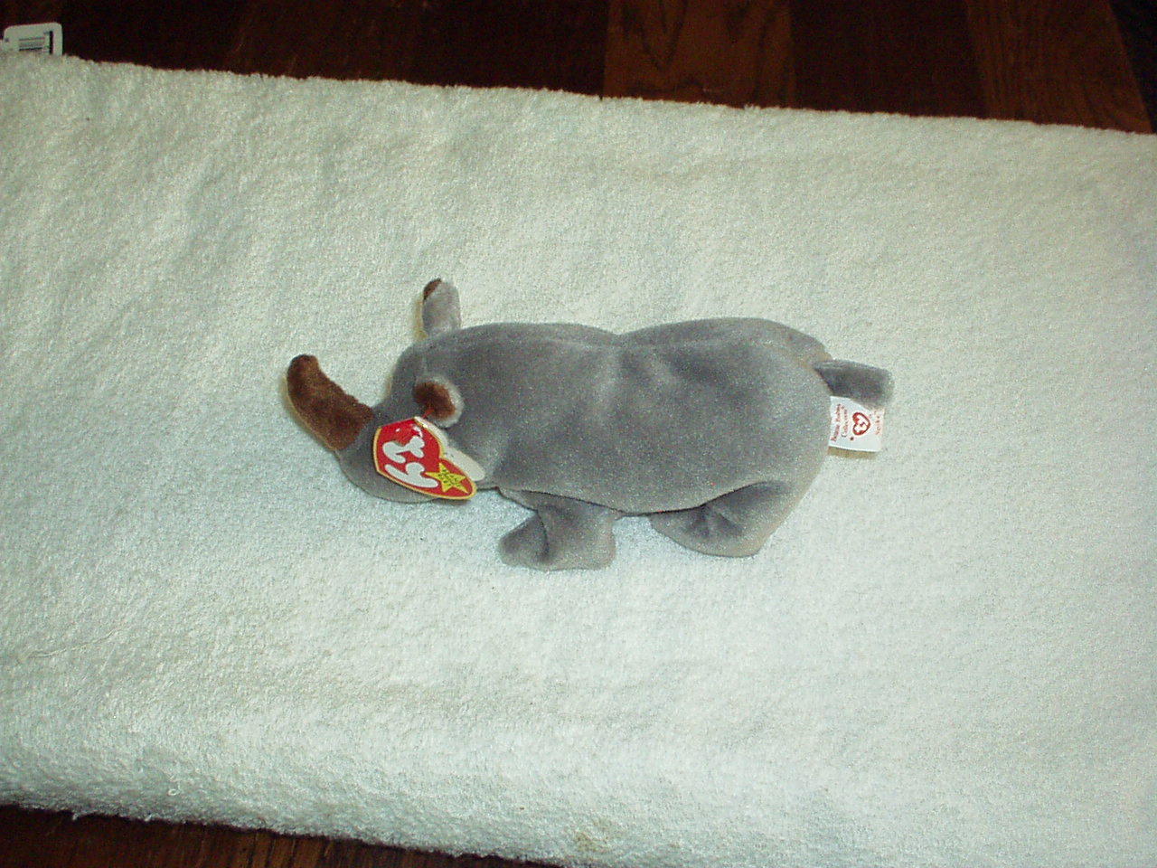 Rare, BRAND NEW original 1996 SPIKE The RHINO 7.5" H Beanies Babies with all NEW Tags. Purchased by original adult in 1996 or 1997 stored away inside plastic since. FIRST TIME Touched to photo Adorable Spike. His ERRORS INFO include: **A SPACE AFTER THE WORD "LIKE" IN POEM , THEN ! SIGN **PINK "O" STAMP ON TUSH TAG (SOME STAMPED SOME NOT) **MADE OF P.E. PELLETS **HANDMADE IN CHINA **NO STYLE NO # ON PAPER TAG **RETIRED/BRAND NEW (NEVER DISPLAYED!) A Must for Any Collector.