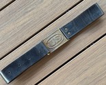 A key identifier of the M1874 belt is this cast brass rectangular buckle with a relief "US" within an oval. This was a standard buckle for enlisted men and non-commissioned officers. The reverse of buckle depicts the benchmark of ?4?. There is a small crack, lower left side where the leather belt passes thru the buckle.