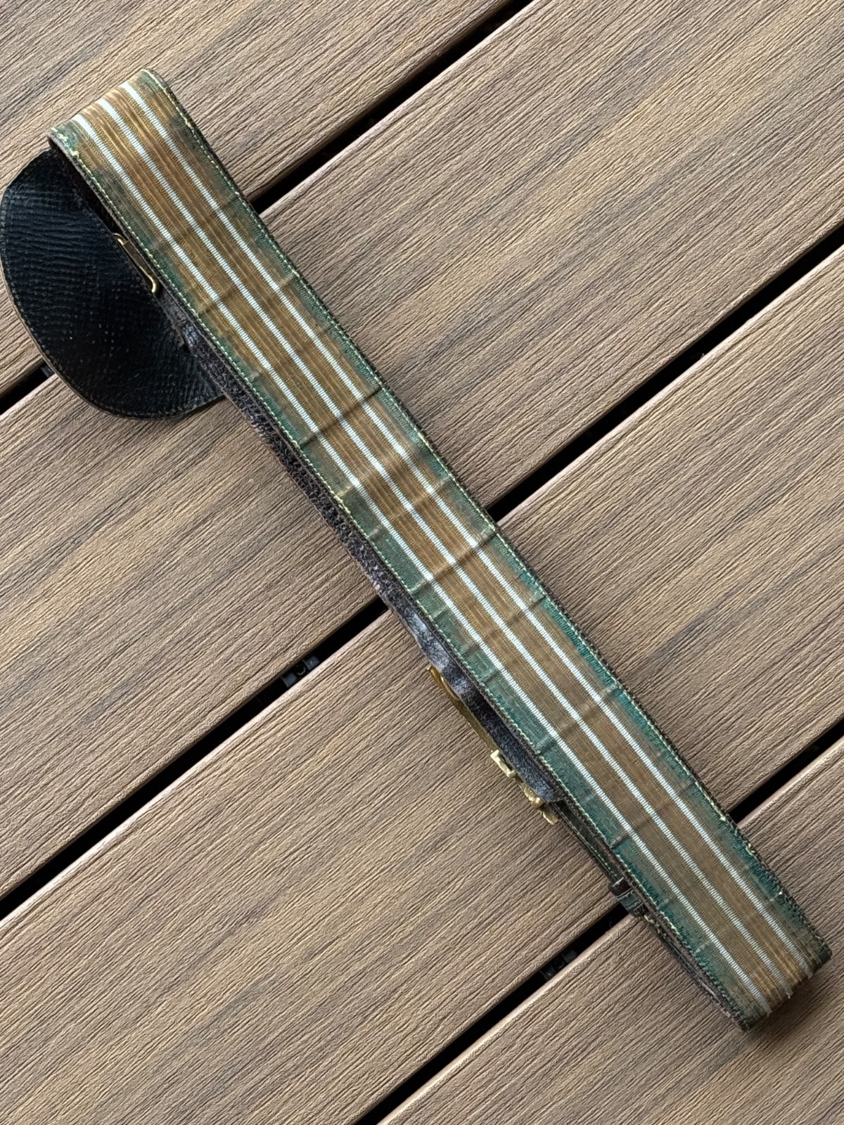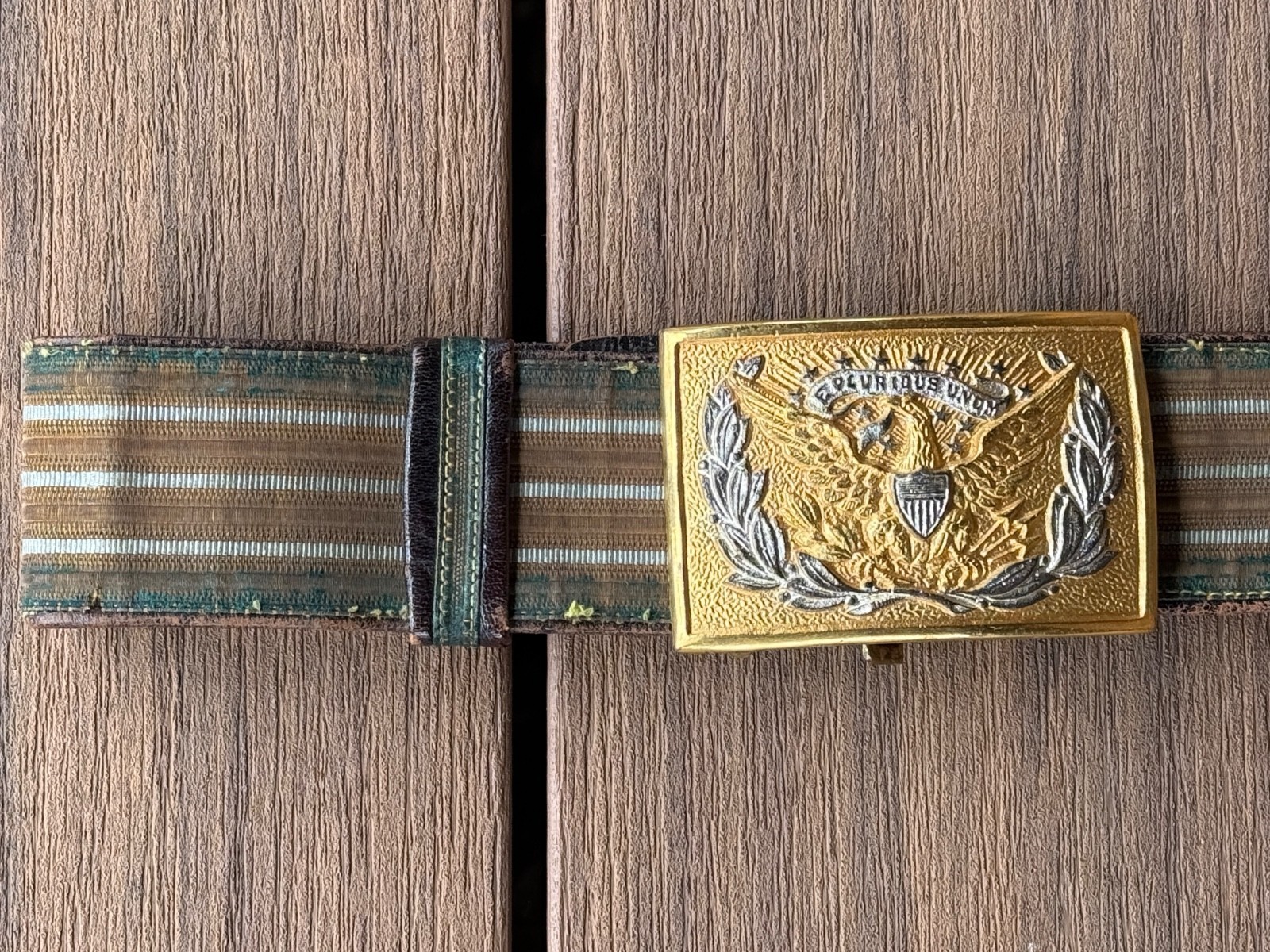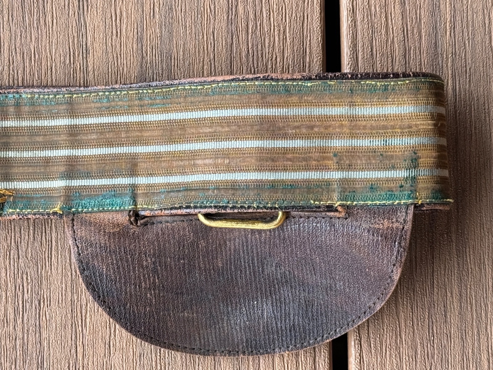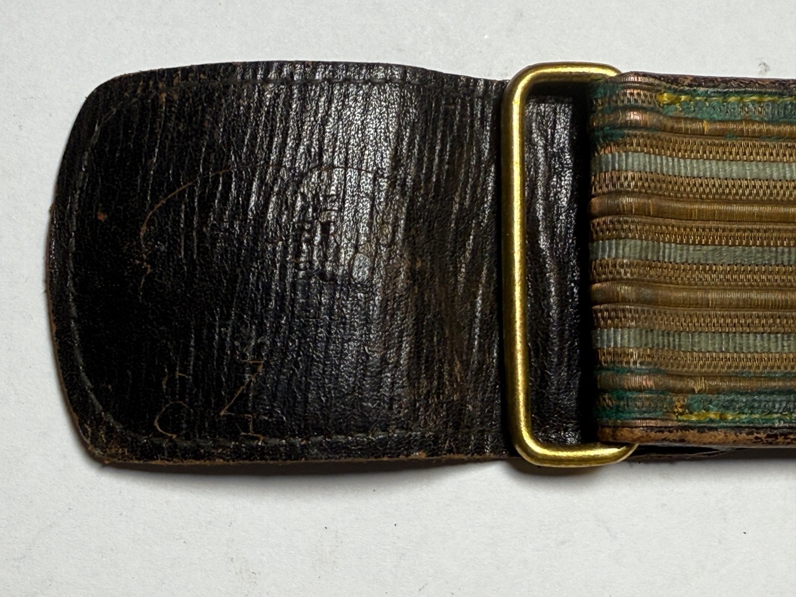 The belt has four rows of gold lace with three rows of light blue colored silk between them sewn onto black leather. Gold lace is mildly tarnished. 1902 pattern for a Company Grade Infantry Officer. The color of the silk indicated the officer's branch of service. For example, cavalry officers wore yellow silk, infantry officers wore blue, artillery officers wore red, and medical officers wore purple.