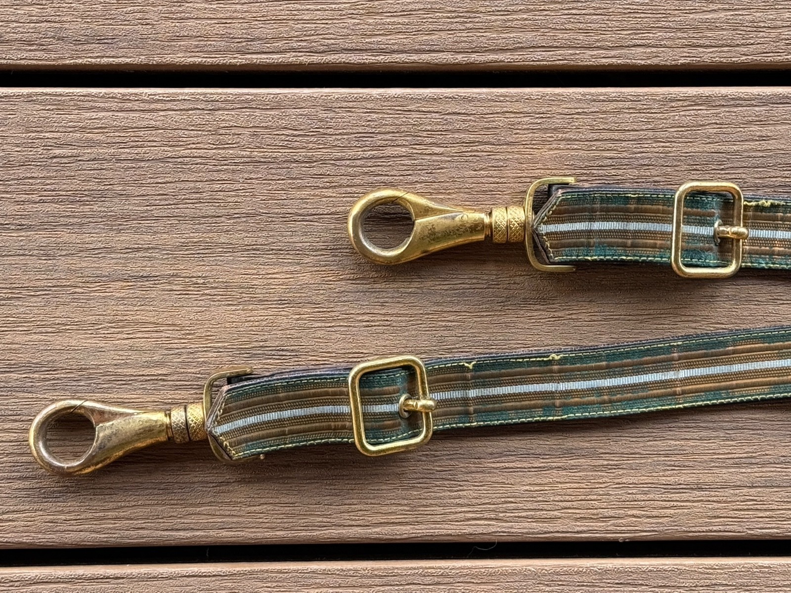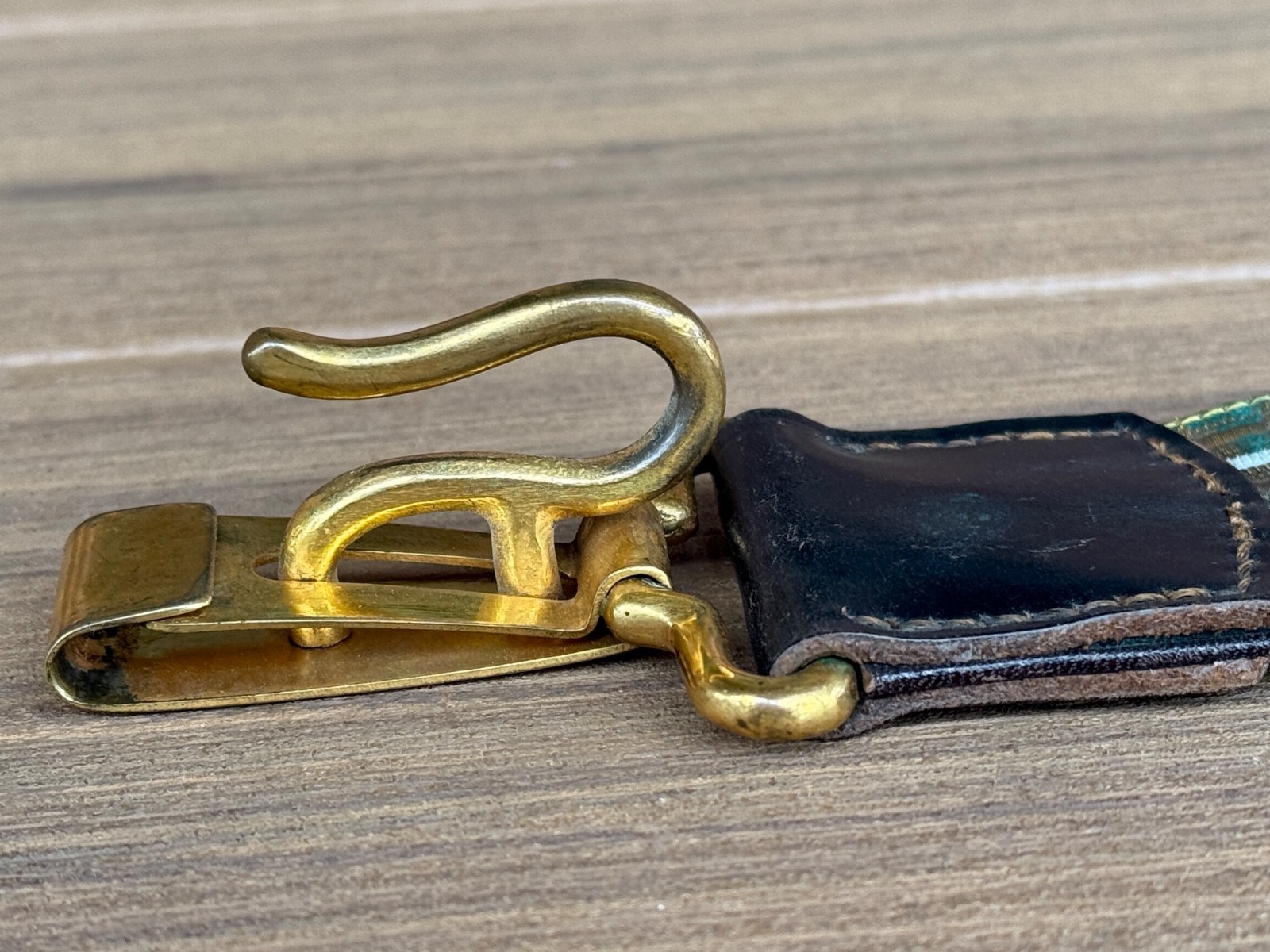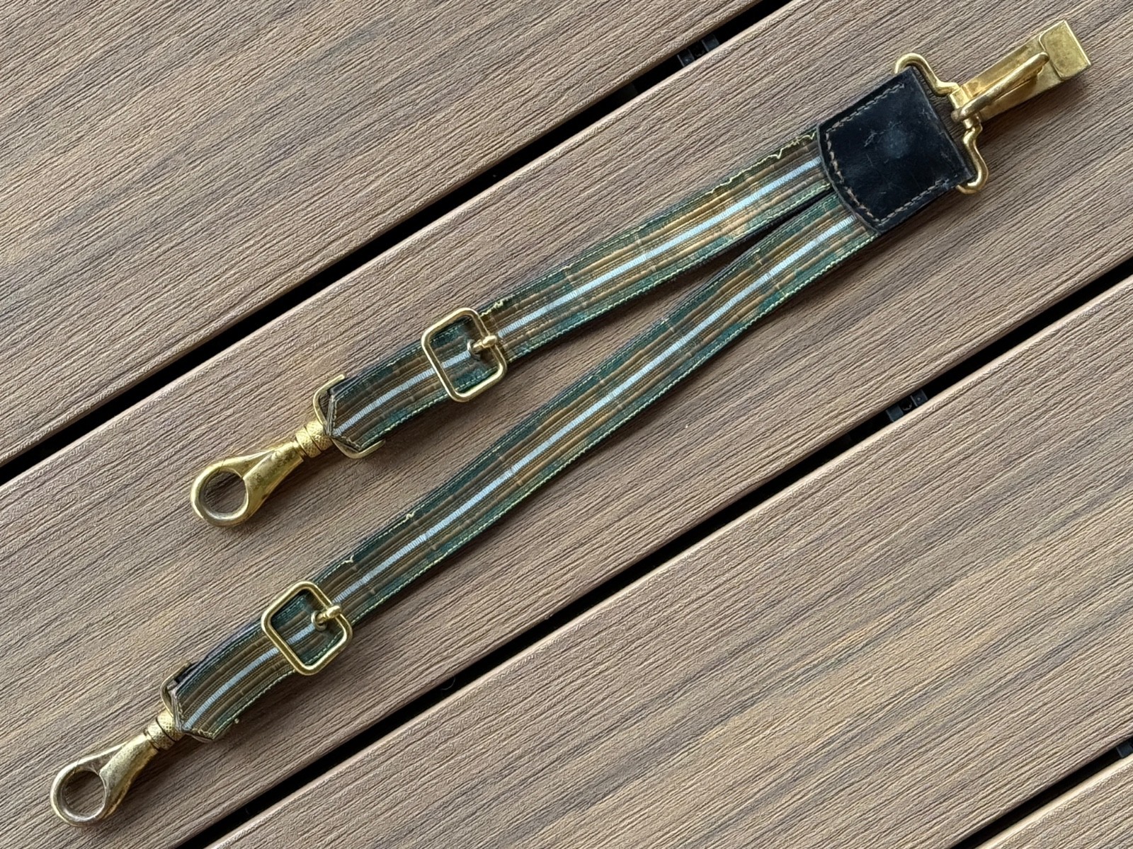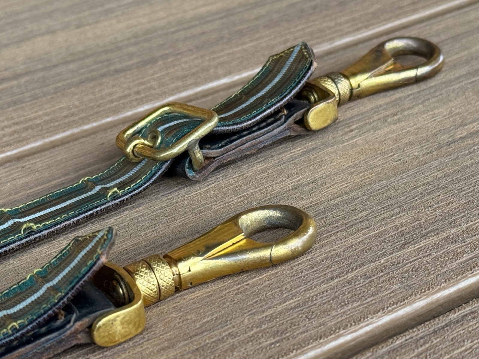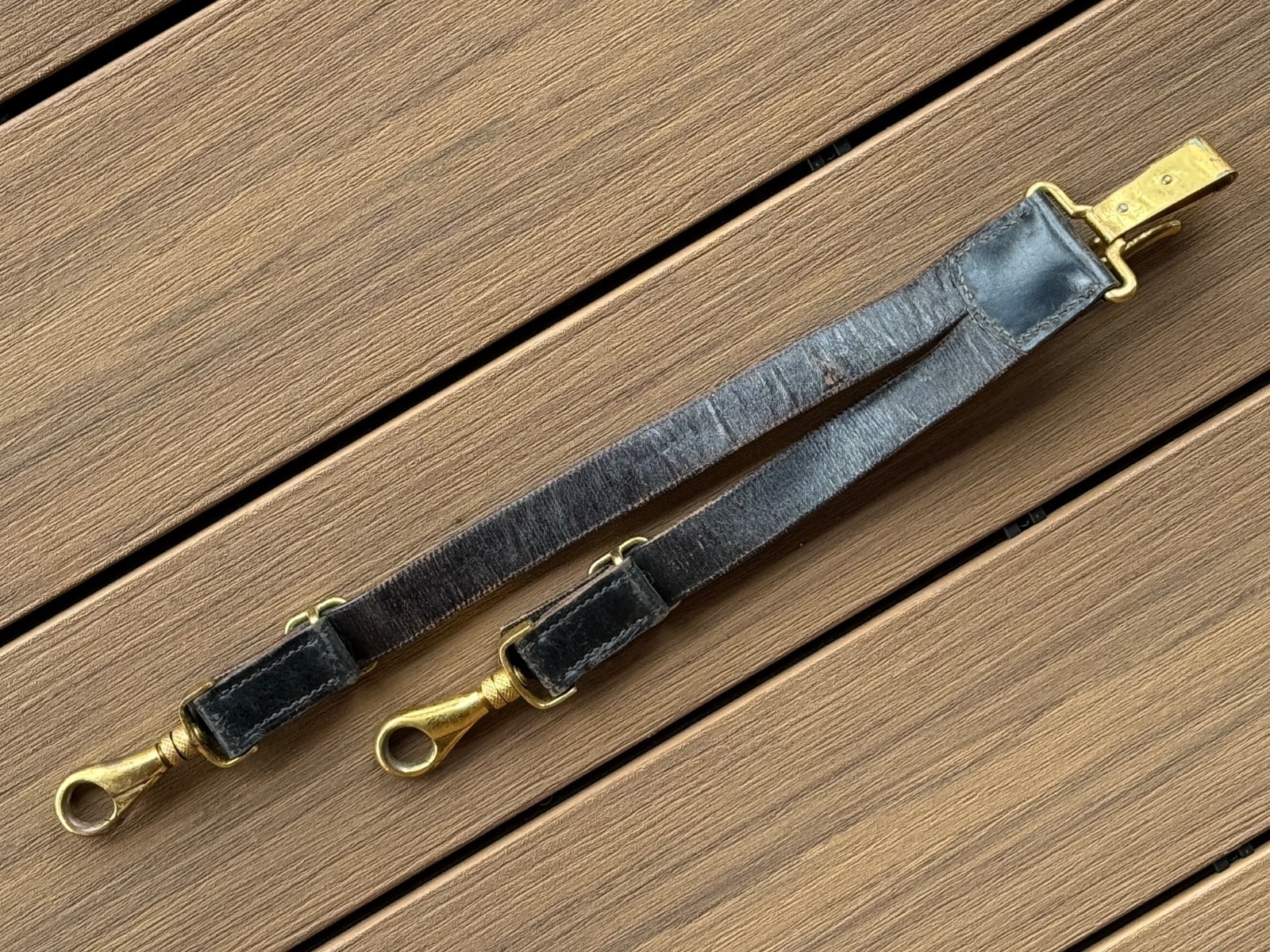 Spring hooks with screw tighteners are hung on leather chapes and attached to straps with bar buckles.
