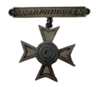 Nice clean Sharpshooter badge. The brooch is incised, marked, "SEPT 1, 1910" Pinback with open loop catch. Three rings on target. These were made by Rock Island Arsenal.