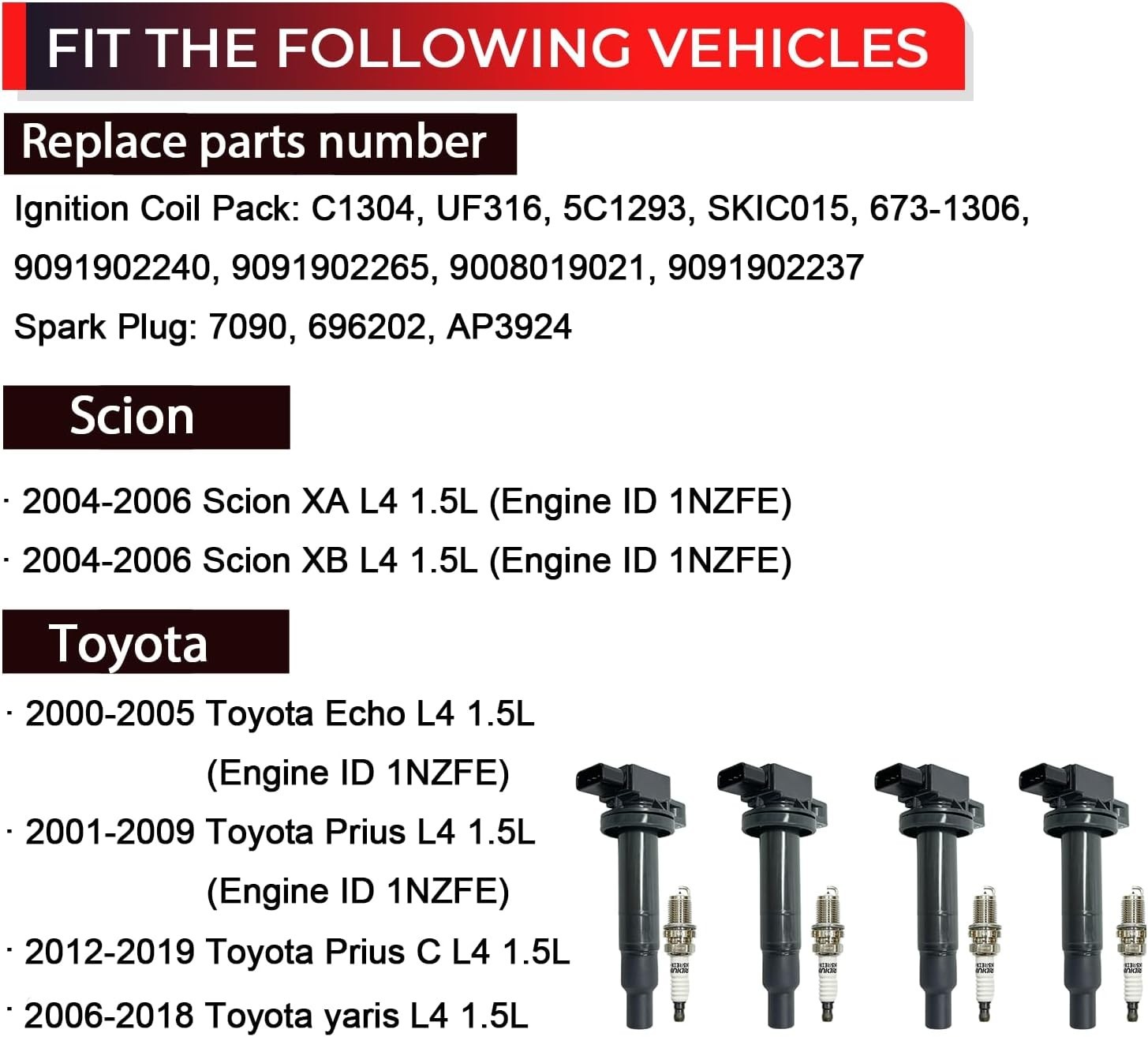[Reference Number] Ignition Coil Pack: C1304, UF316, 5C1293, SKIC015, 673-1306, 9091902240, 9091902265, 9008019021, 9091902237; Spark Plug: 7090, 696202, AP3924 [Vehicle Fitment] The lgnition coil packs and spark plugs set compatible with Toyota Prius 2001-2009, Prius C 2012-2019, Echo 2000-2005, Yaris 2006-2018; compatible with Scion XA 2004-2006, Scion XB 2004-2006------L4 1.5L [Superior quality] Ignition Coil pack is made of high quality material and spark plug is double iridium spark plug, with good heat dissipation performance, and can resist the heat and thermal cycle caused by the fracture, so as to better transfer the high voltage generated by the spark plug, to ensure the accuracy of the ignition time, improve the combustion efficiency, reduce exhaust gas emissions [Enhanced Coil and Spark Plug] Set of 4 Ignition Coil Packs and Spark Plugs. Match with original parts, easy and quick installation, while the new ignition coil, effectively provide the proper voltage to the spark plug electrode, to provide excellent cold start performance and smoother engine running, long service life [Choosing the Right Part] Before buying, research to make sure the part fits your vehicle; enter all vehicle information (year, make, model, engine, and interior) to ensure compatibility, and check the qualifying instructions and that a professional installation is recommended