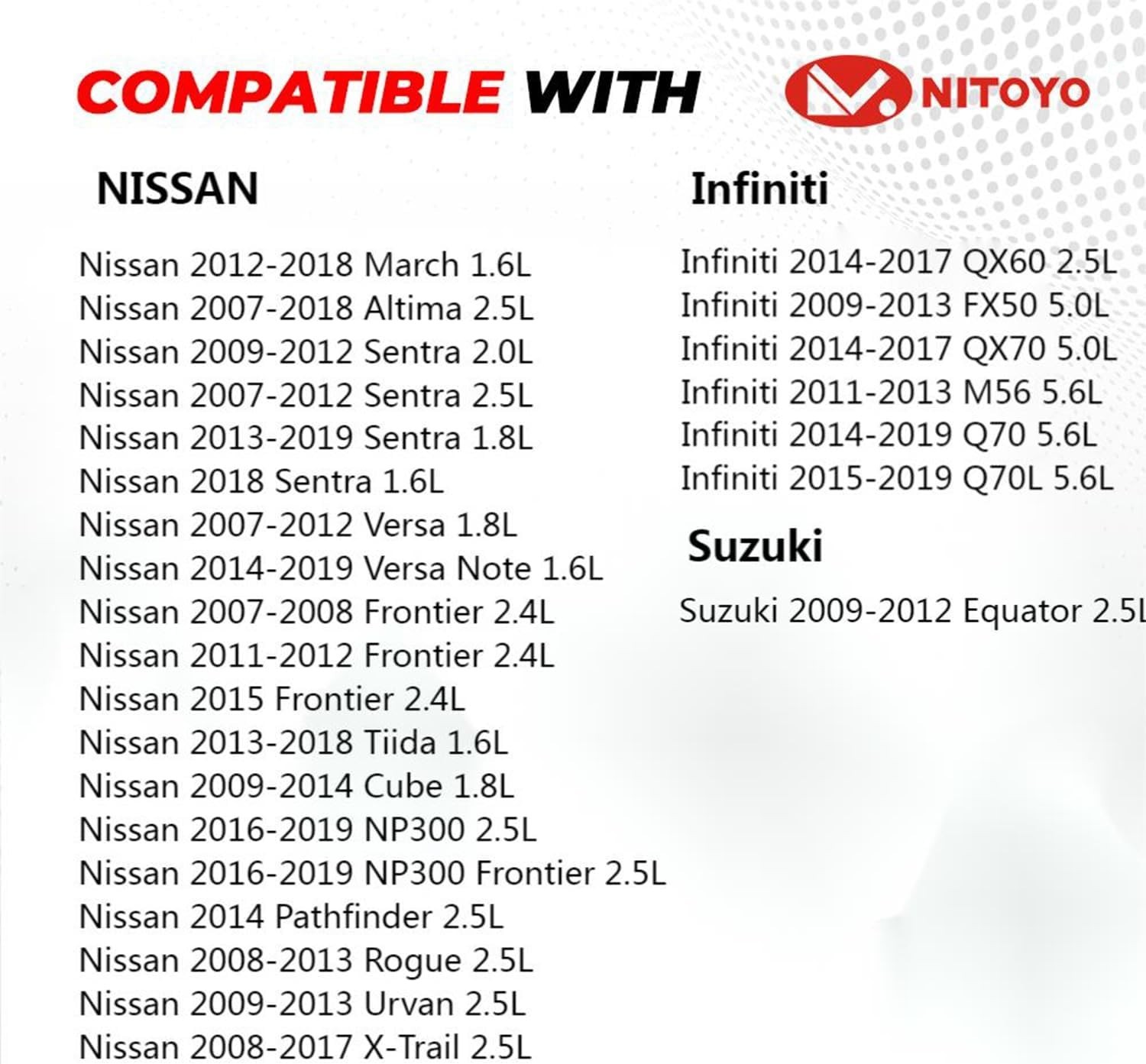 ?Fitment?It can perfectly compatible with Nissan Altima 2007-2018, Sentra 2009-2019, Versa 2007-2019, Frontier 2007-2015, NP300 2016-2019; compatible with Nissan Rogue 2008-2013, Pathfinder 2014; compatible with Infiniti QX60 QX70 2014-2017, Q70L 2015-2019. For more models, please see the fitment table ?Directly Replace? It can directly replace original OEM part and work like the original one. Coil: UF549, C1696, 5C1753, E1049, 22448JA00A; Spark plug: 9029 ?Durable Material?The exterior of ignition coil and Spark Plugs is made of high-strength engineering Material to prevent the ignition coil from being melted due to overheating of the engine. And the interior of ignition coil is made of high-conductivity Material for faster ignition. ?Easy Installation?Fast and easy installation with superior performance and reliability. Please make sure that each part is installed on the correct part, professional installation is recommended. ?Package Include? 4 Set Ignition Coil Pack and Spark Plug