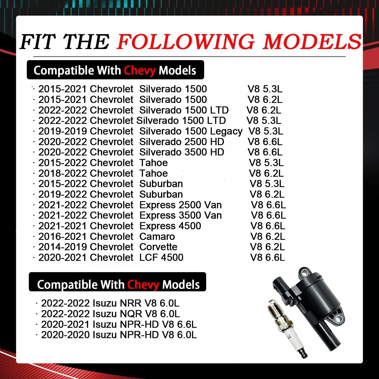 [Vehicle Fitment] Ignition Coil Pack Compatible with Chevy Silverado 1500 2015-2022, Tahoe 2015-2022, Suburban 2015-2022, Camaro 2016-2021, Corvette 2014-2019; Compatible with GMC Sierra 1500 2014-2022, Yukon 2015-2022, Savana 2021-2022; Compatible with Cadillac CTS 2016-2019, Escalade / Escalade ESV 2015-2022----5.3L / 6.2L.Please check the complete compatibility list before purchasing #687,610 in Automotive (See Top 100 in Automotive) #2,129 in Automotive Replacement Ignition Coil Packs