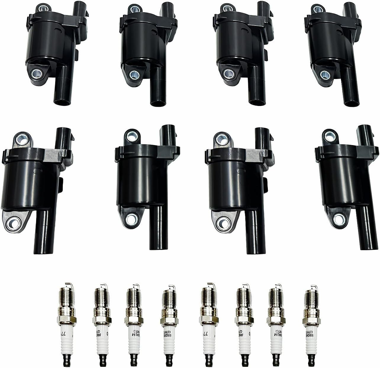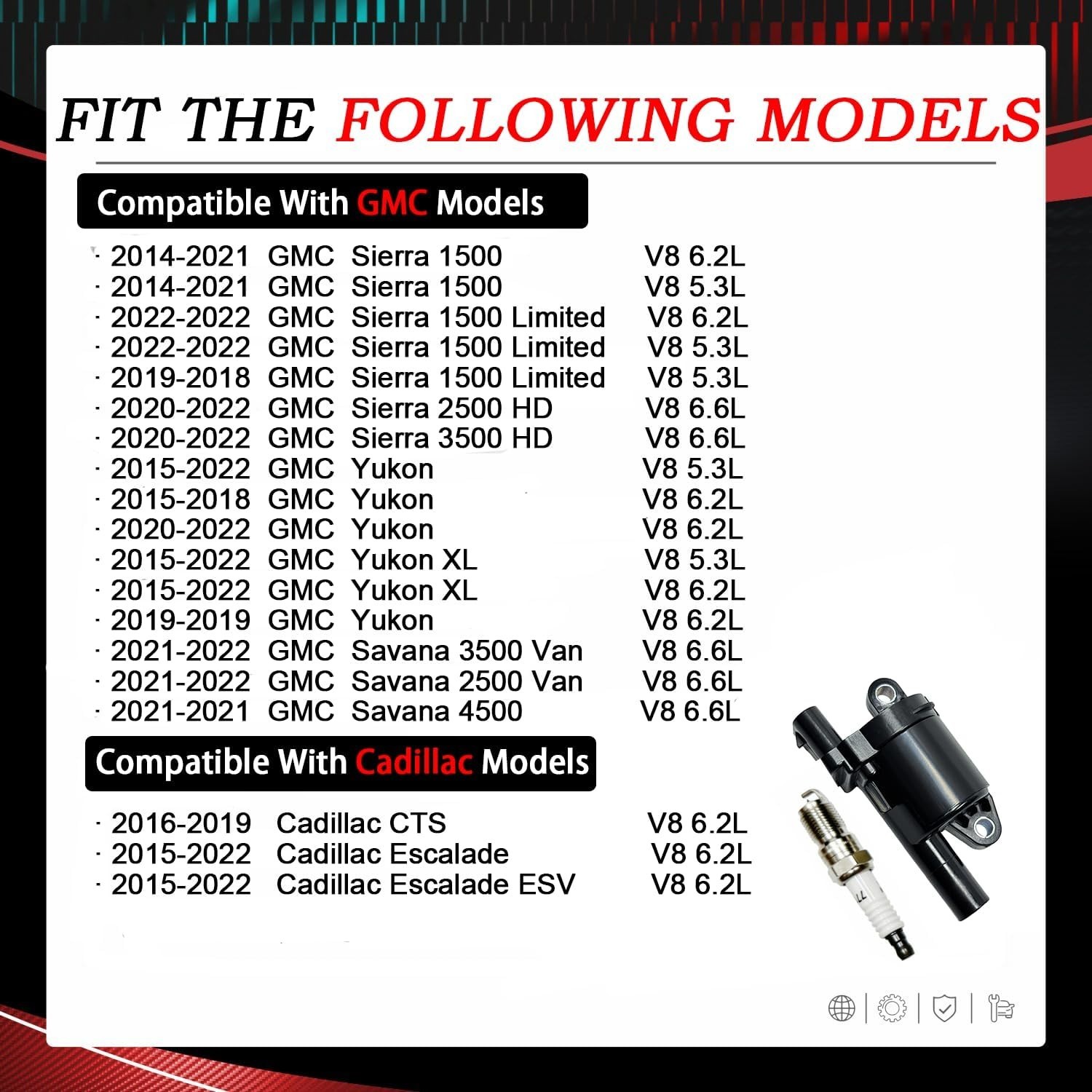 [Reference Number] UF742, UF-742, C866, 5C1876, C1819, 12621750, 12658183, 12674754, 12699383, 12708496 [Vehicle Fitment] Ignition Coil Pack Compatible with Chevy Silverado 1500 2015-2022, Tahoe 2015-2022, Suburban 2015-2022, Camaro 2016-2021, Corvette 2014-2019; Compatible with GMC Sierra 1500 2014-2022, Yukon 2015-2022, Savana 2021-2022; Compatible with Cadillac CTS 2016-2019, Escalade / Escalade ESV 2015-2022----5.3L / 6.2L.Please check the complete compatibility list before purchasing [Superior quality] Ignition Coil is made of high quality material, with good heat dissipation performance, and can resist the heat and thermal cycle caused by the fracture, so as to better transfer the high voltage generated by the spark plug, to ensure the accuracy of the ignition time, improve the combustion efficiency, reduce exhaust gas emissions [Enhanced Coil and Spark Plug] Set of 8 Ignition Coil Packs and Spark Plugs. Match with original parts, easy and quick installation, while the new ignition coil, effectively provide the proper voltage to the spark plug electrode, to provide excellent cold start performance and smoother engine running, long service life [Choosing the Right Part] Before buying, research to make sure the part fits your vehicle; enter all vehicle information (year, make, model, engine, and interior) to ensure compatibility, and check the qualifying instructions and that a professional installation is recommended