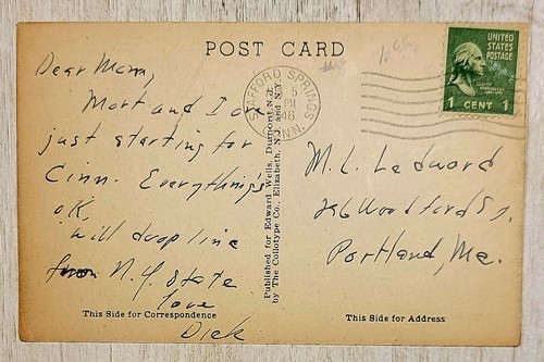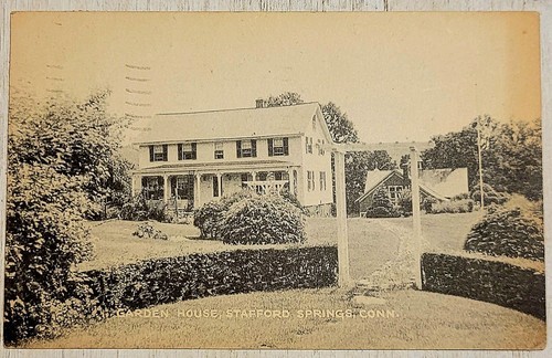Stamp has partial stamping across. Postcard is dated to pre 1946...postcard itself has value. Depicts Garden House in Stafford Springs, Conneticut