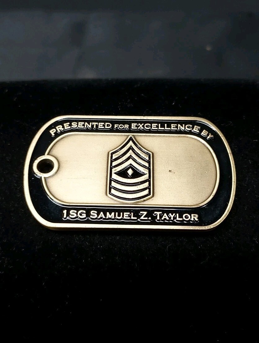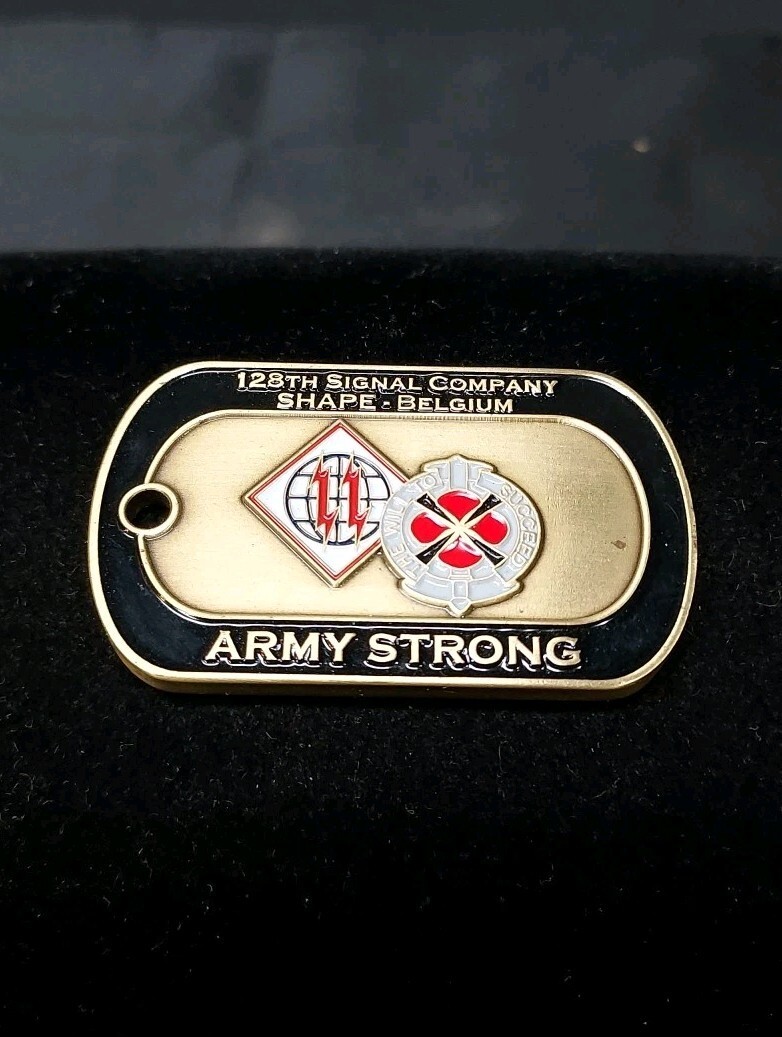 US Army 128th Signal Co. Dog Tag Shaped Challenge Coin By 1SG Samuel Z. Taylor. Condition is Used. Shipped with USPS Ground Advantage.
