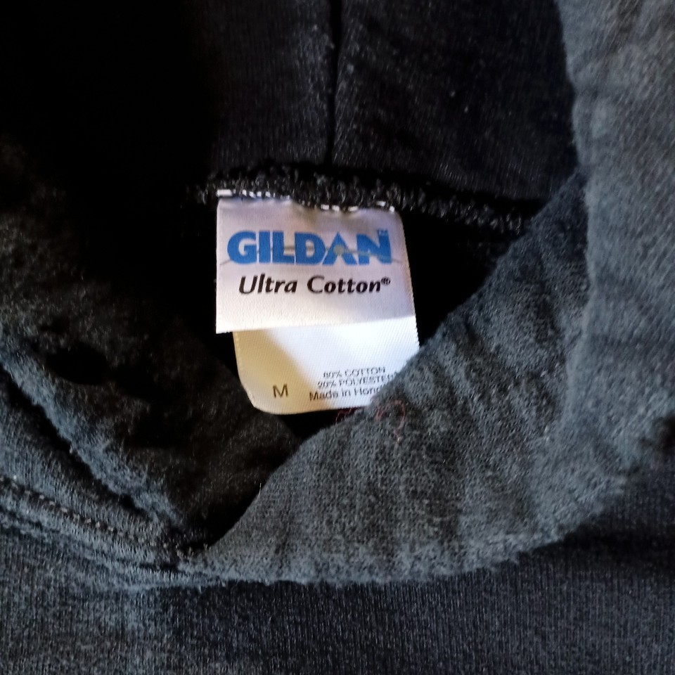 The USMC Amphibious Reconnaissance Hoodie Sweatshirt in Size M is a black pullover with a yellow print featuring the USMC theme. Made by Gildan, this hoodie is machine washable and hooded but missing the drawstring. It is suitable for all seasons and is a versatile piece for men's activewear. The regular fit and pullover style make it comfortable and practical for various activities. Good condition, normal wear. Note Missing Drawstring, see pictures.